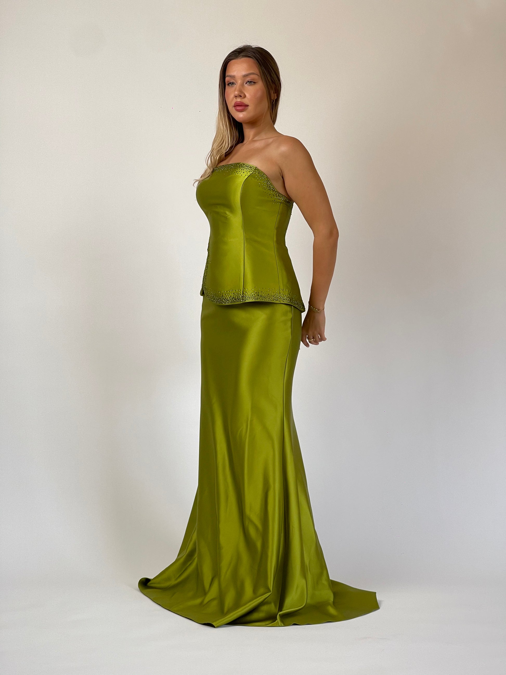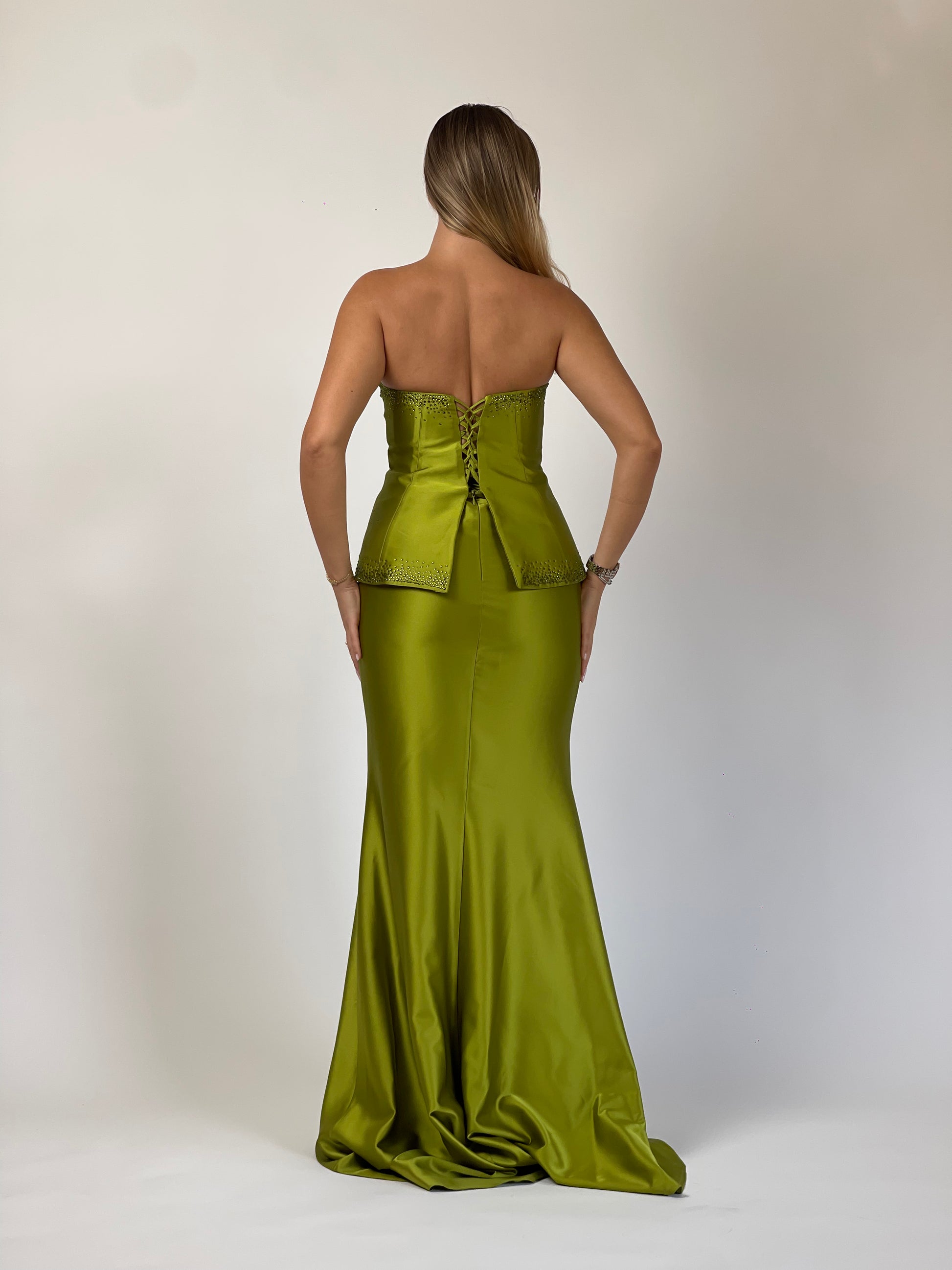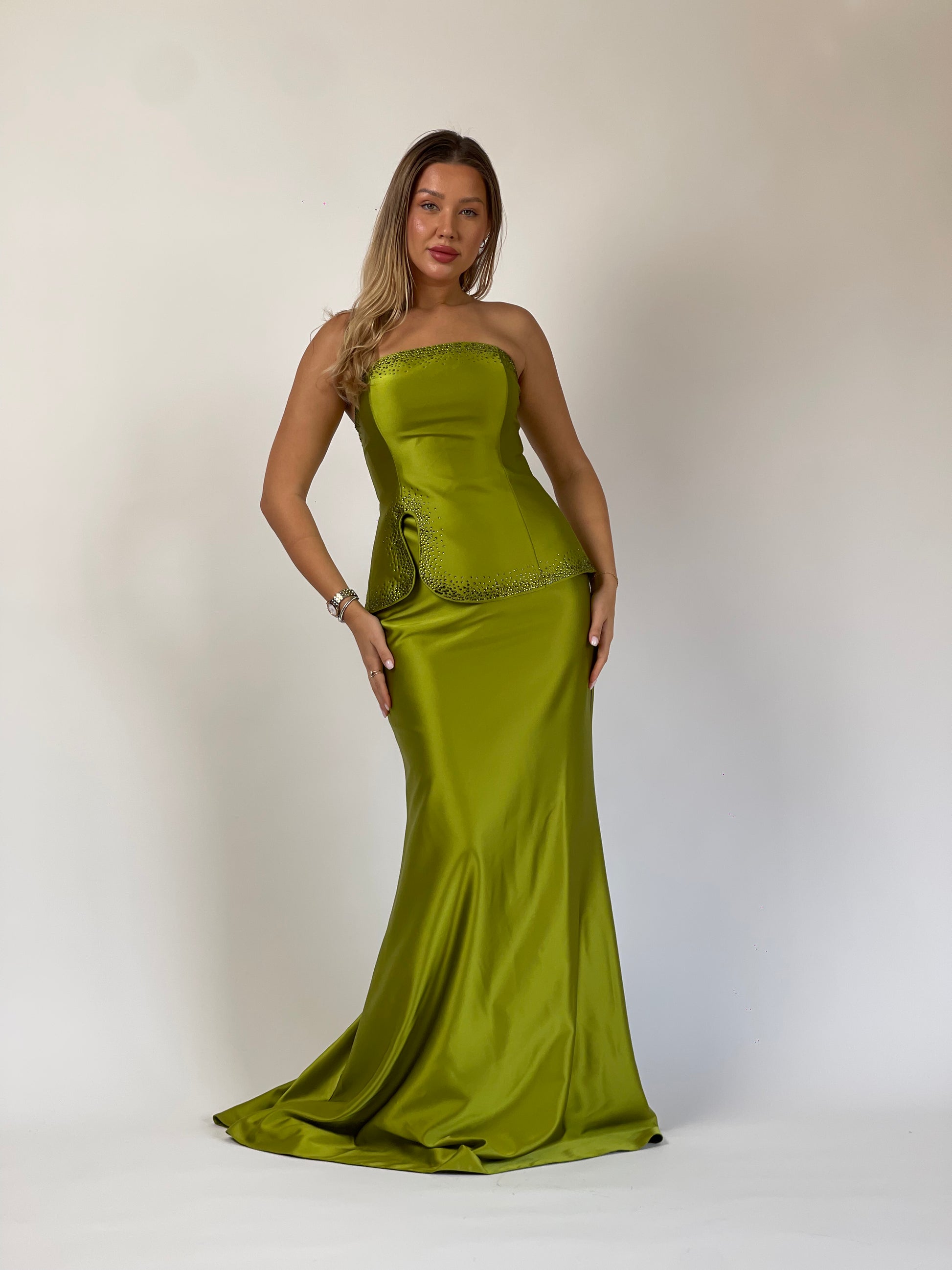 A strapless satin gown in olive green, detailed with subtle crystal accents along the neckline and waist. The sculpted bodice and fluid mermaid silhouette create an effortlessly refined statement.