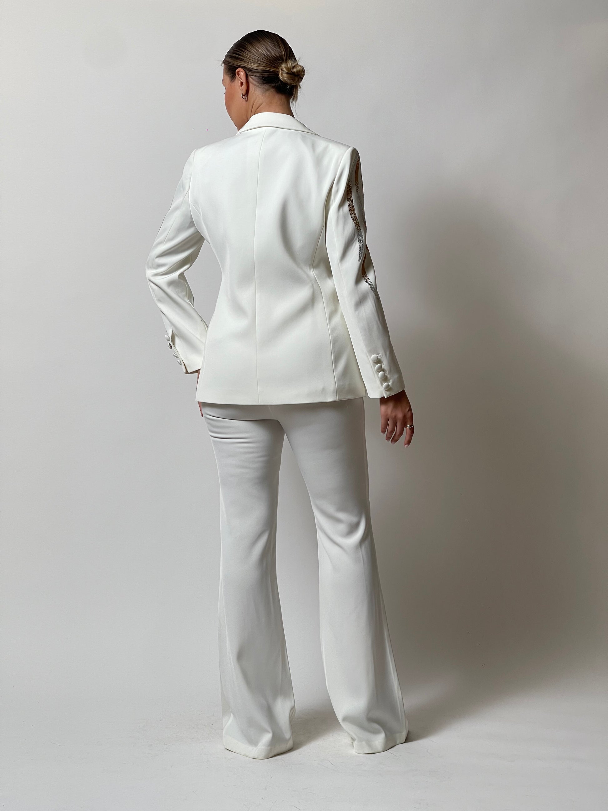 The Celeste White Suit embodies modern minimalism with a touch of radiance. Tailored from lustrous fabric in a clean ivory tone, it’s elevated by hand-applied metallic detailing that adds movement and light to every step. Sleek, feminine, and commanding — this suit is a statement in quiet power and refined grace.