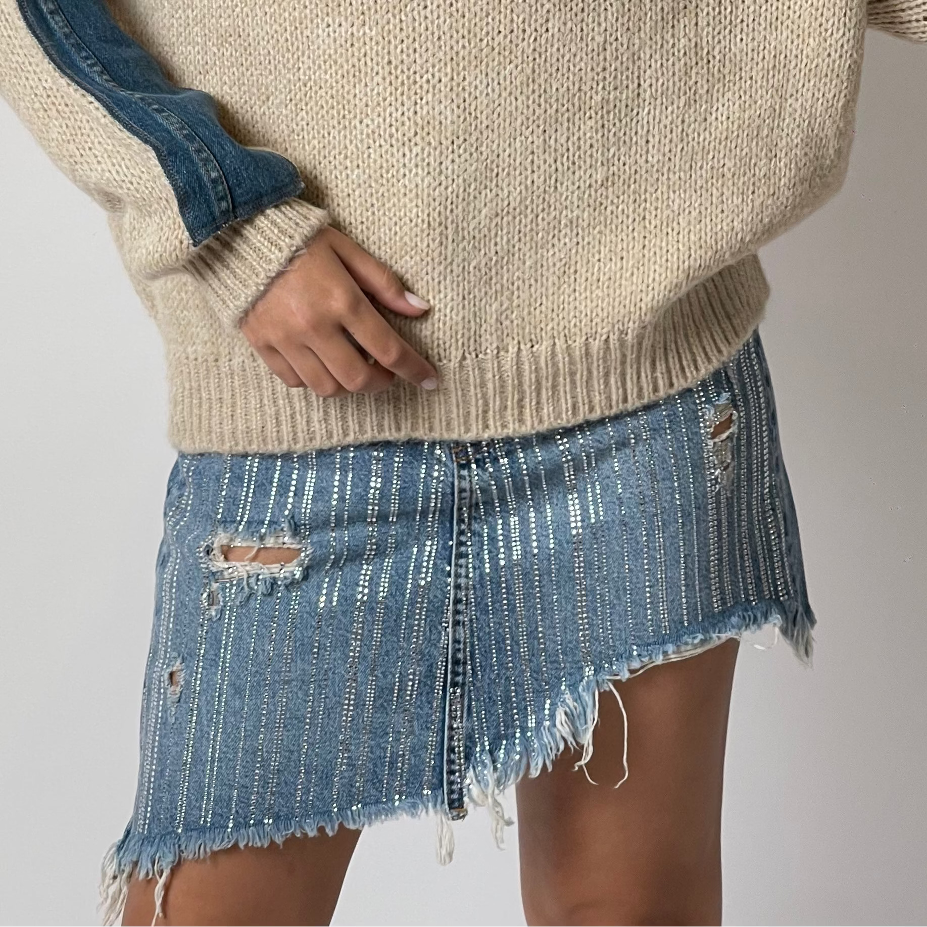 The Distressed Rhinestone Denim Skirt is where edge meets sparkle. Designed with subtle shimmer detailing, raw hems, and a flattering mid-thigh cut, it adds a playful yet bold touch to your look. Style it with knits, blazers, or a simple tee — this skirt elevates every outfit effortlessly.