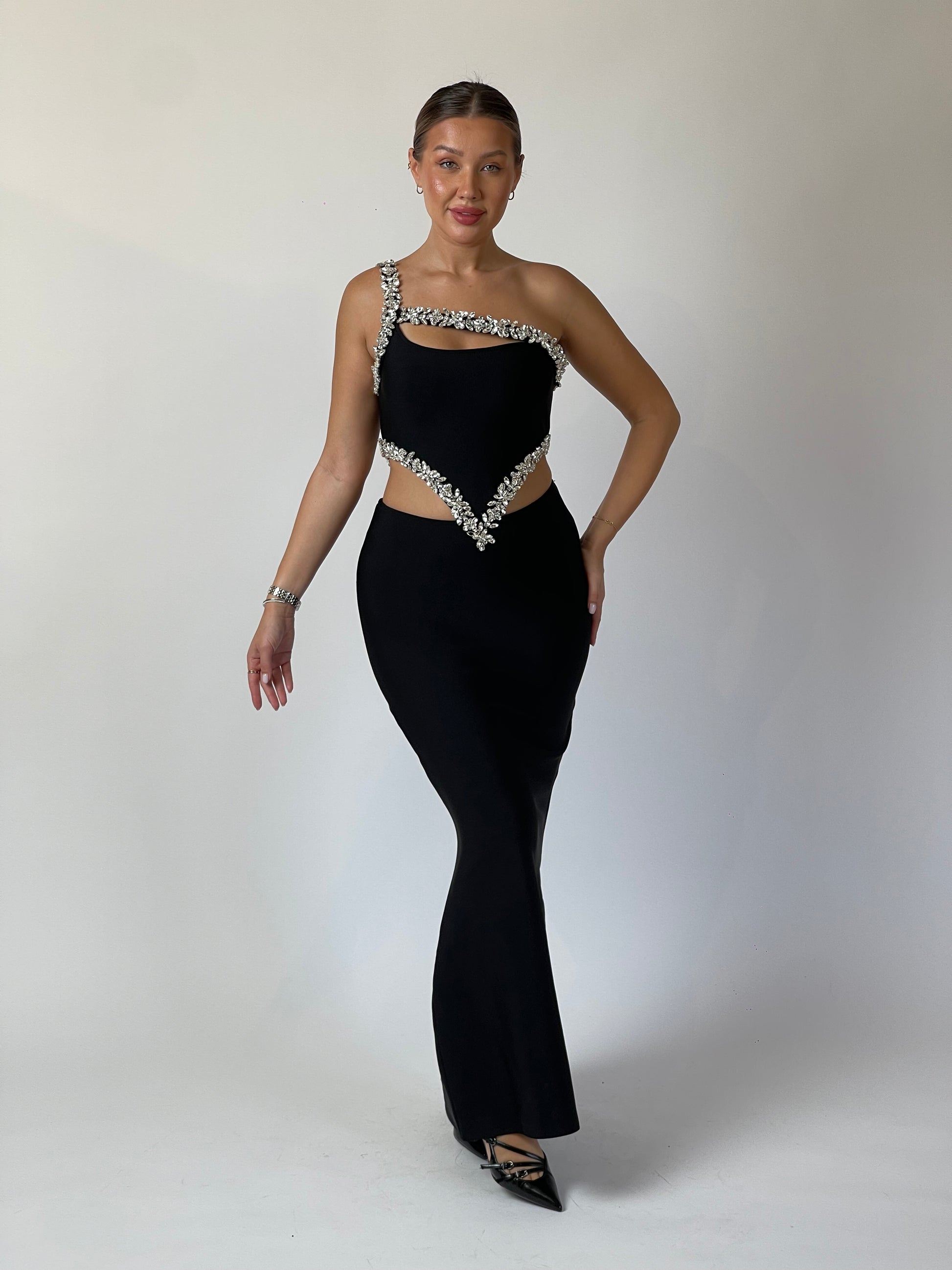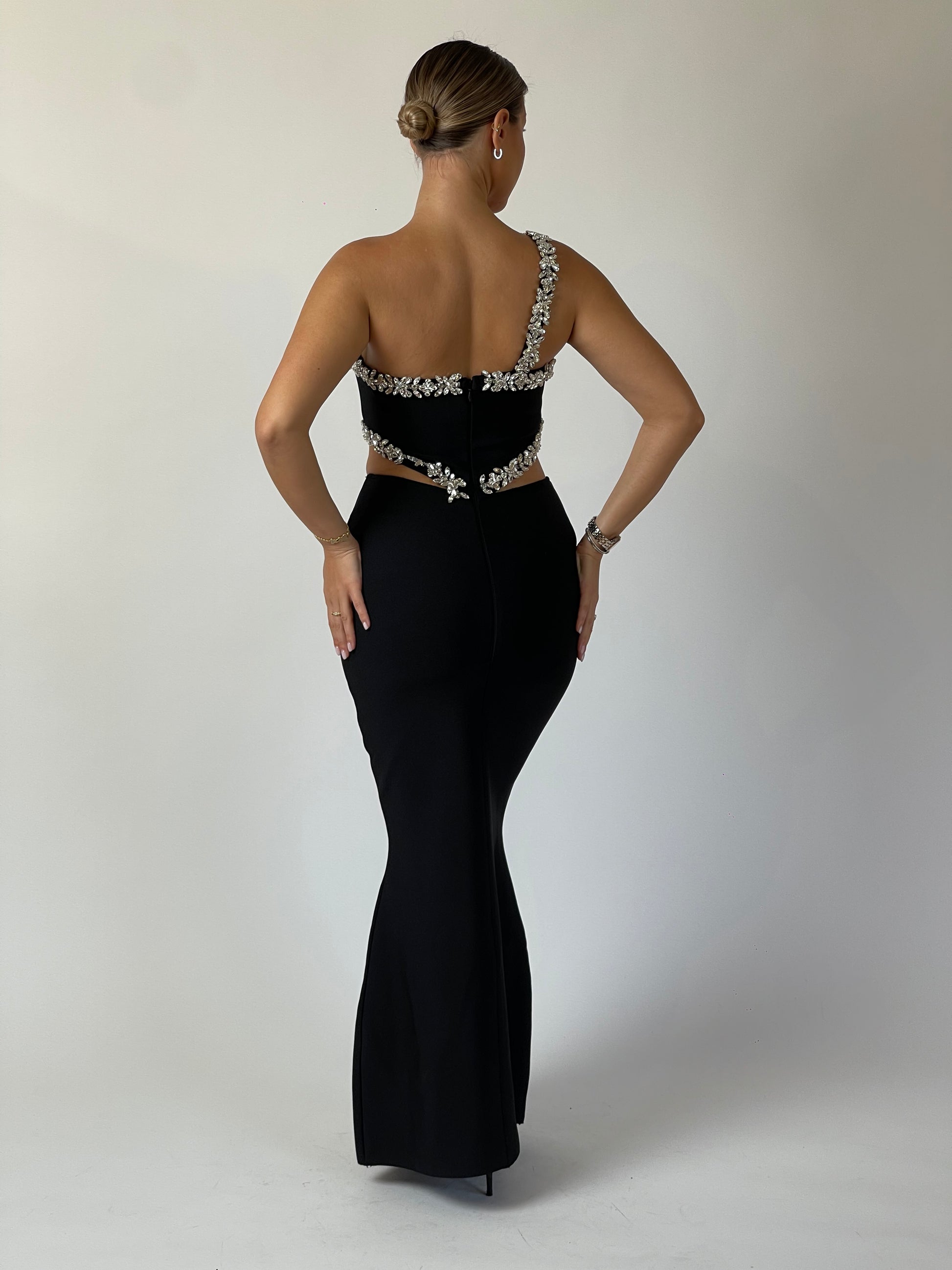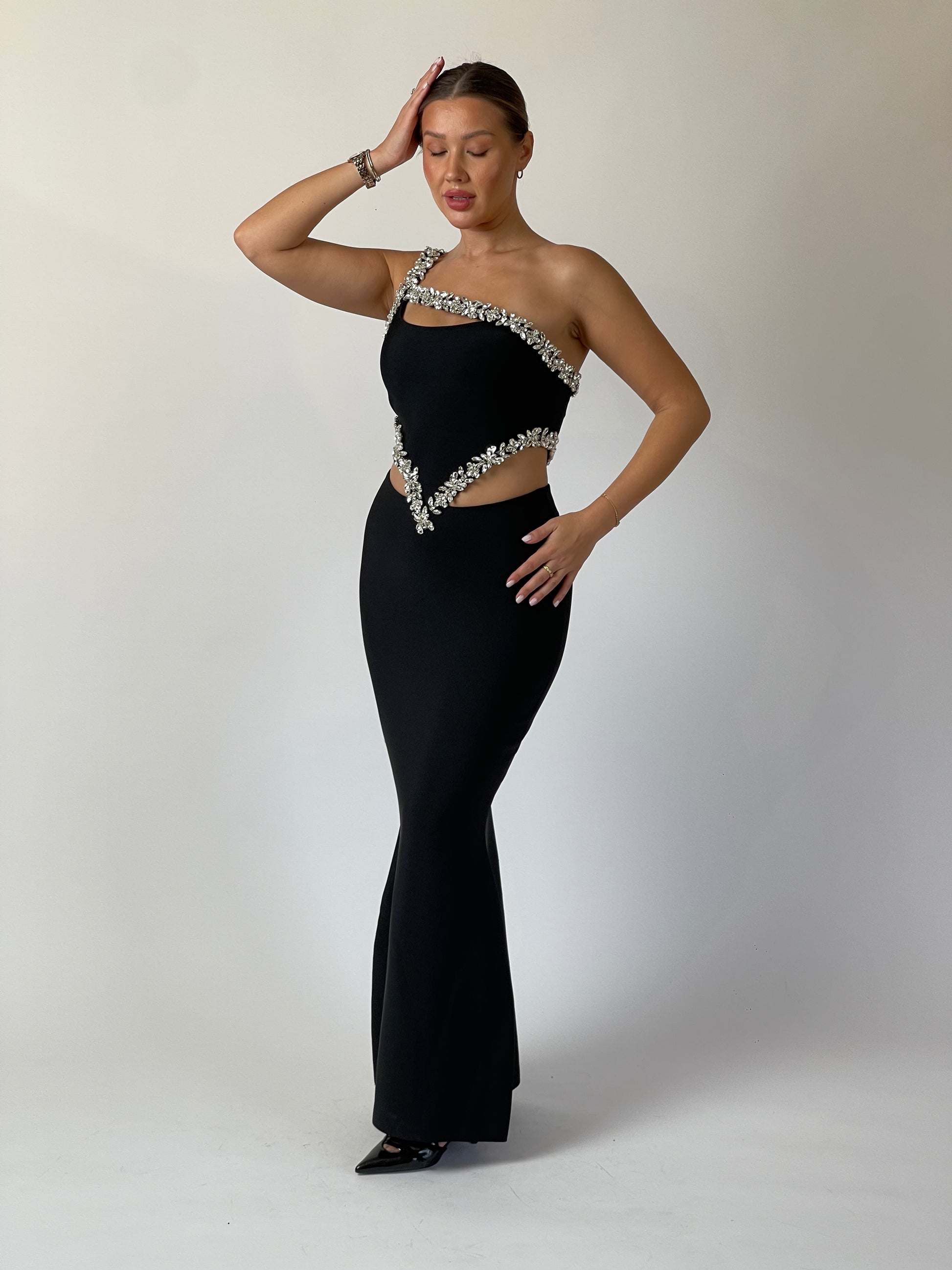 Daring lines meet refined artistry in Eclipse Cut. Designed in sculpted black crepe, the gown redefines elegance with asymmetric crystal detailing that frames the neckline and waist, creating a bold hourglass illusion. A flawless balance between modern edge and timeless sophistication — for the woman who owns the night.