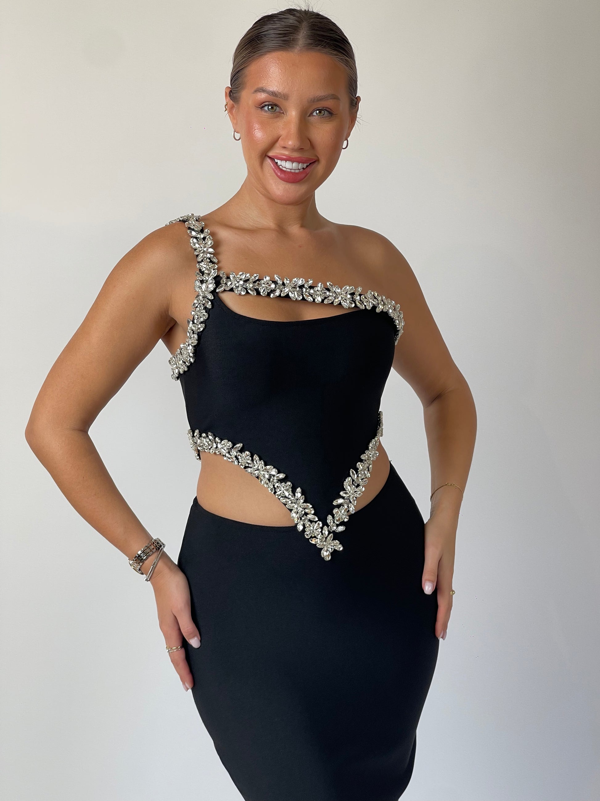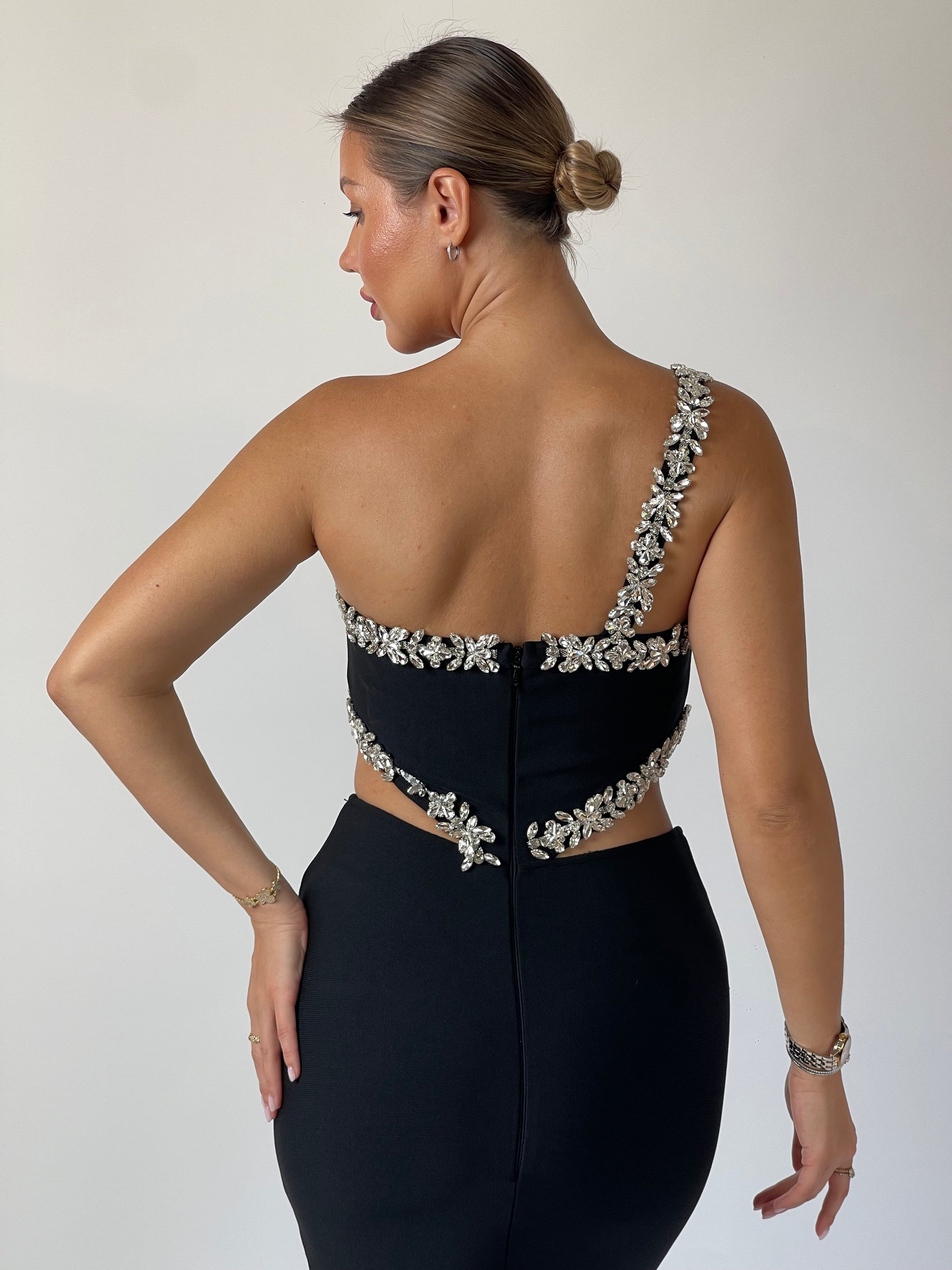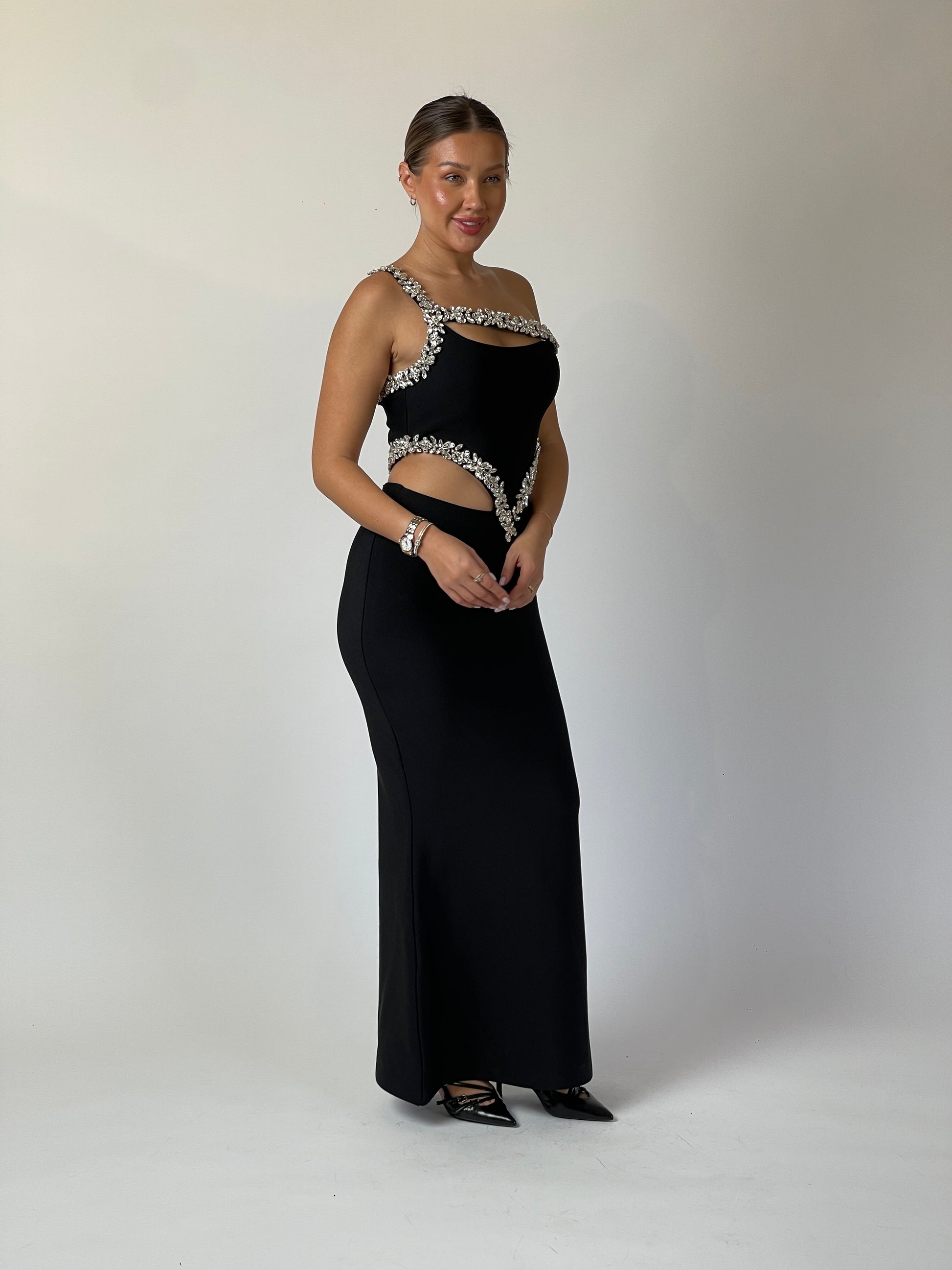 Daring lines meet refined artistry in Eclipse Cut. Designed in sculpted black crepe, the gown redefines elegance with asymmetric crystal detailing that frames the neckline and waist, creating a bold hourglass illusion. A flawless balance between modern edge and timeless sophistication — for the woman who owns the night.