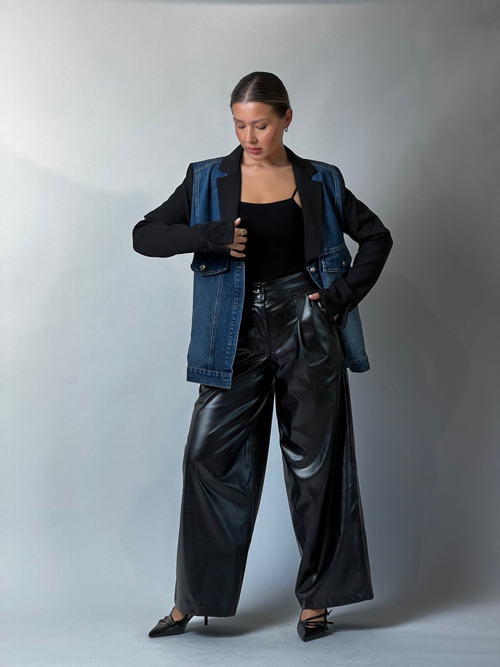 Command attention with Luxe Leather Wide Pants — crafted from premium faux leather with a high waist and fluid silhouette. These pants balance power and ease, giving every step a confident flow. Perfectly paired with blazers, corsets, or knits for a high-impact statement.
