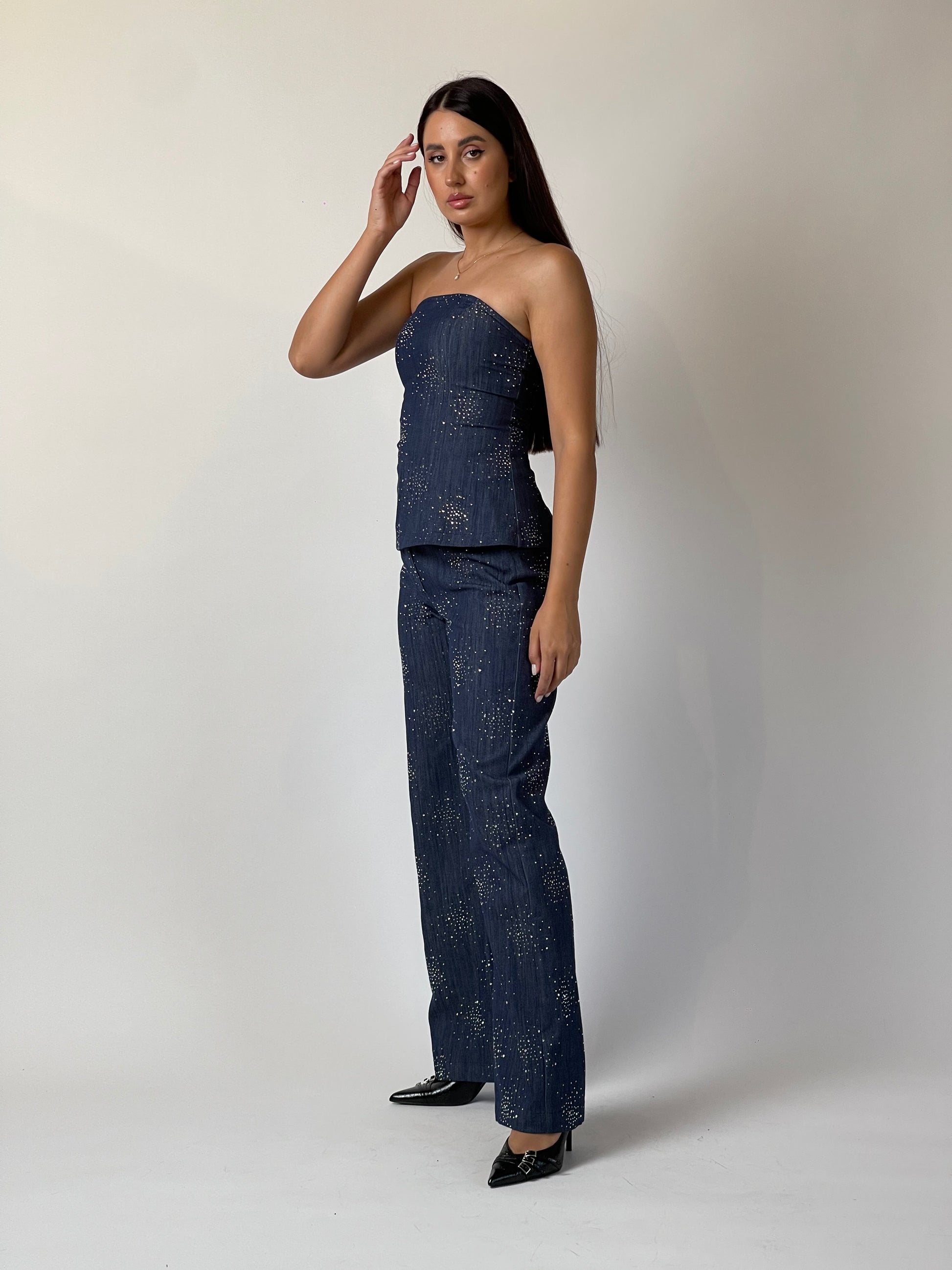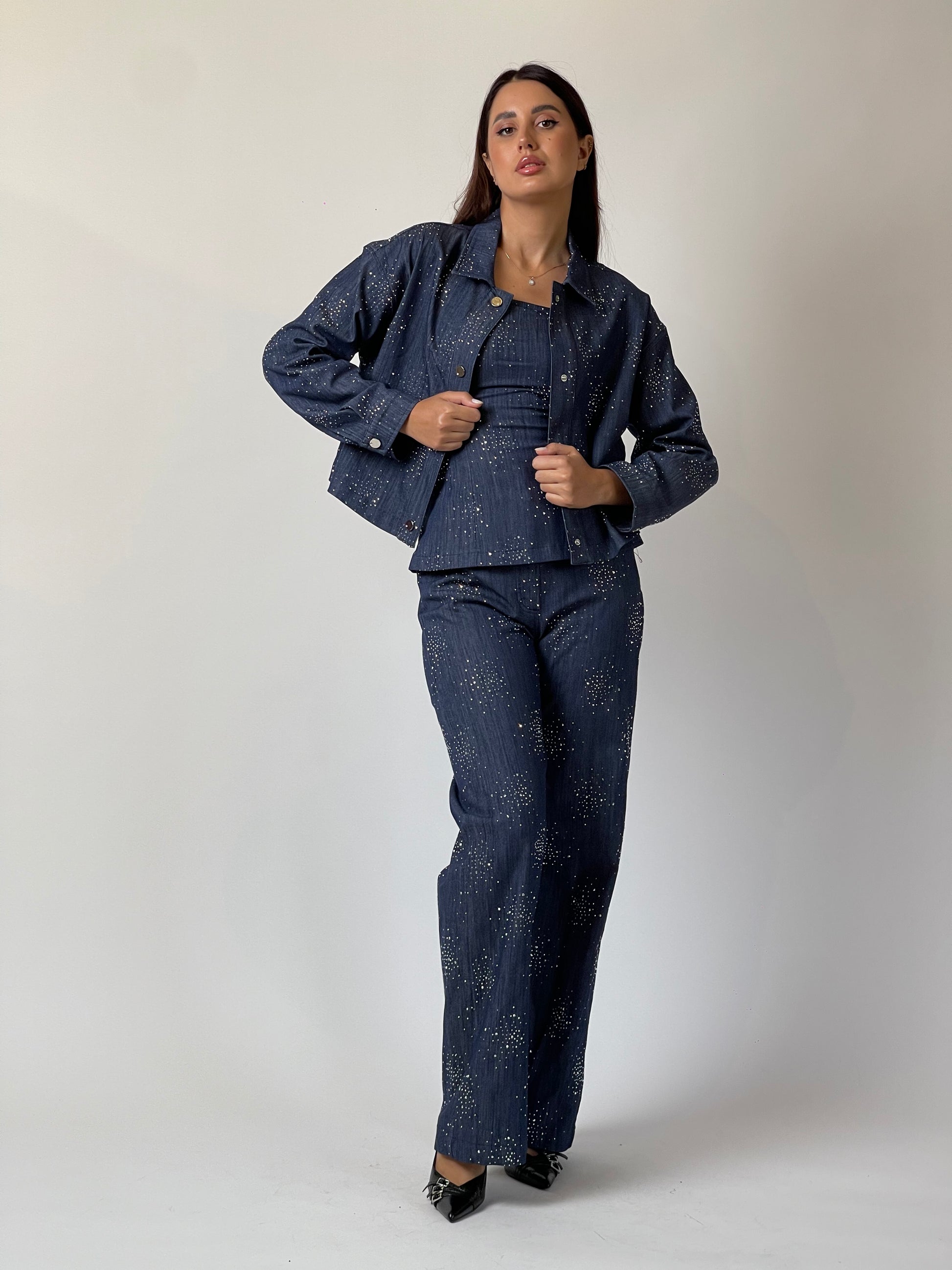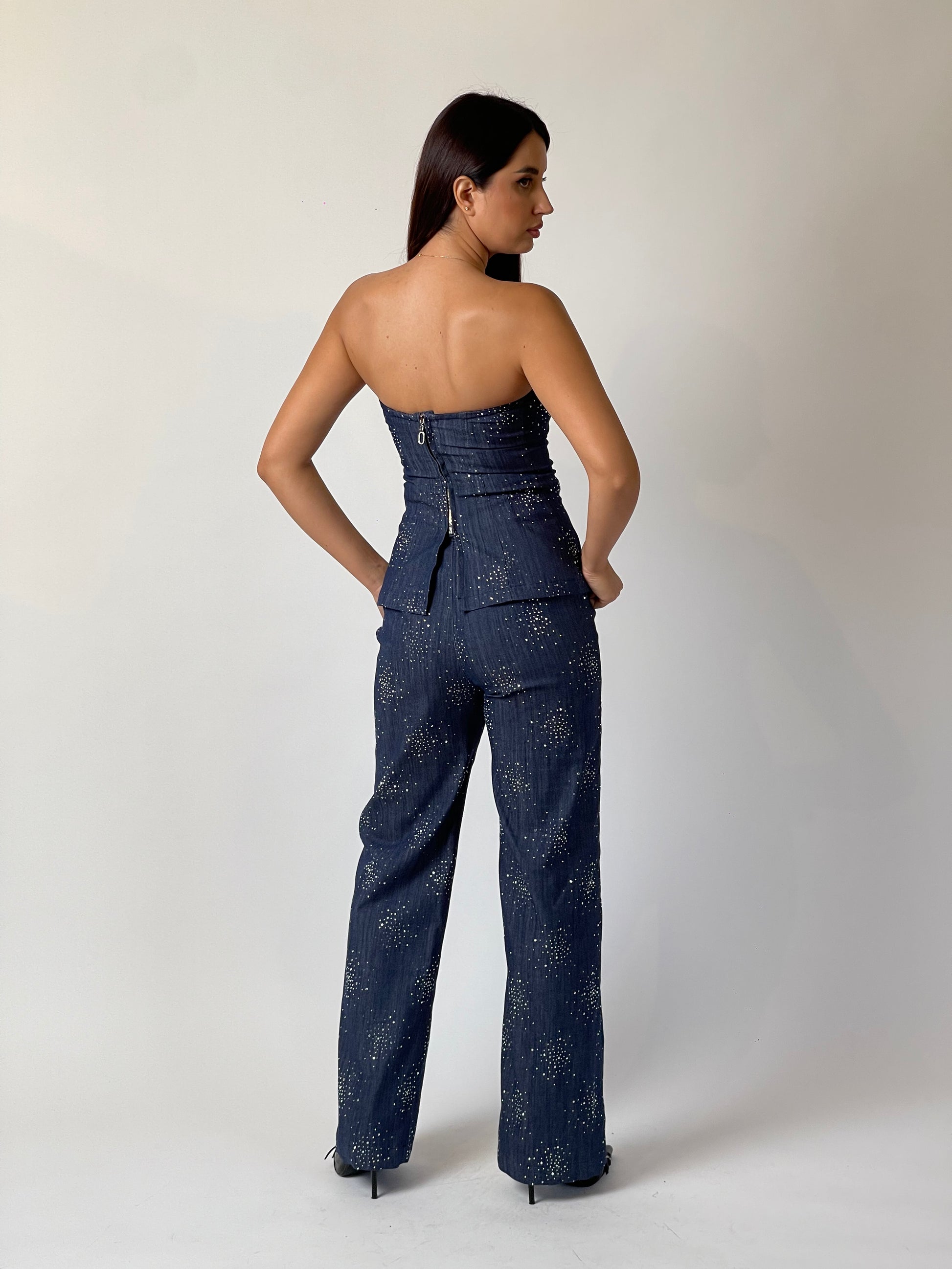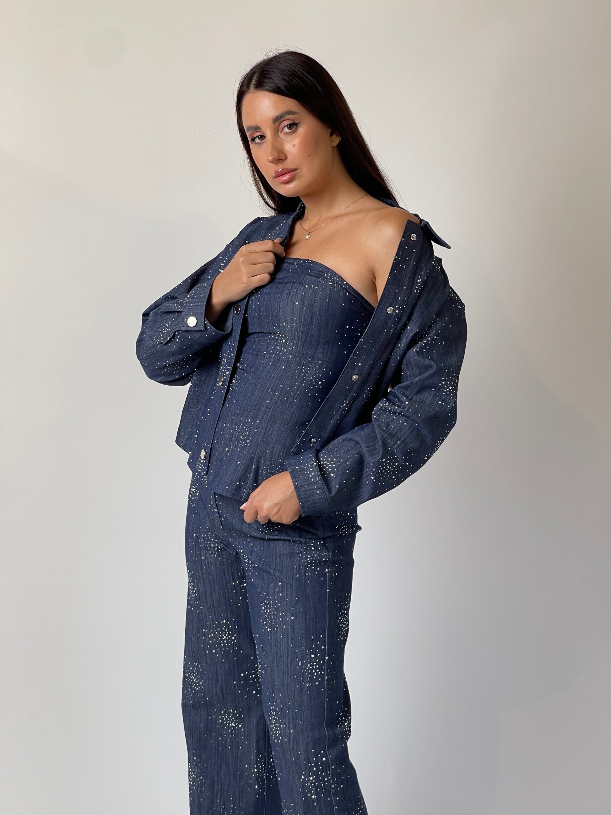 Where denim meets evening glow — Midnight Dusk Set redefines contemporary elegance. This 3-piece coord includes a structured corset top, wide-leg trousers, and a matching jacket all crafted in deep indigo denim with delicate scattered crystal embellishments that shimmer like a night sky. Designed to balance power and femininity, it’s a modern statement for both day and night.