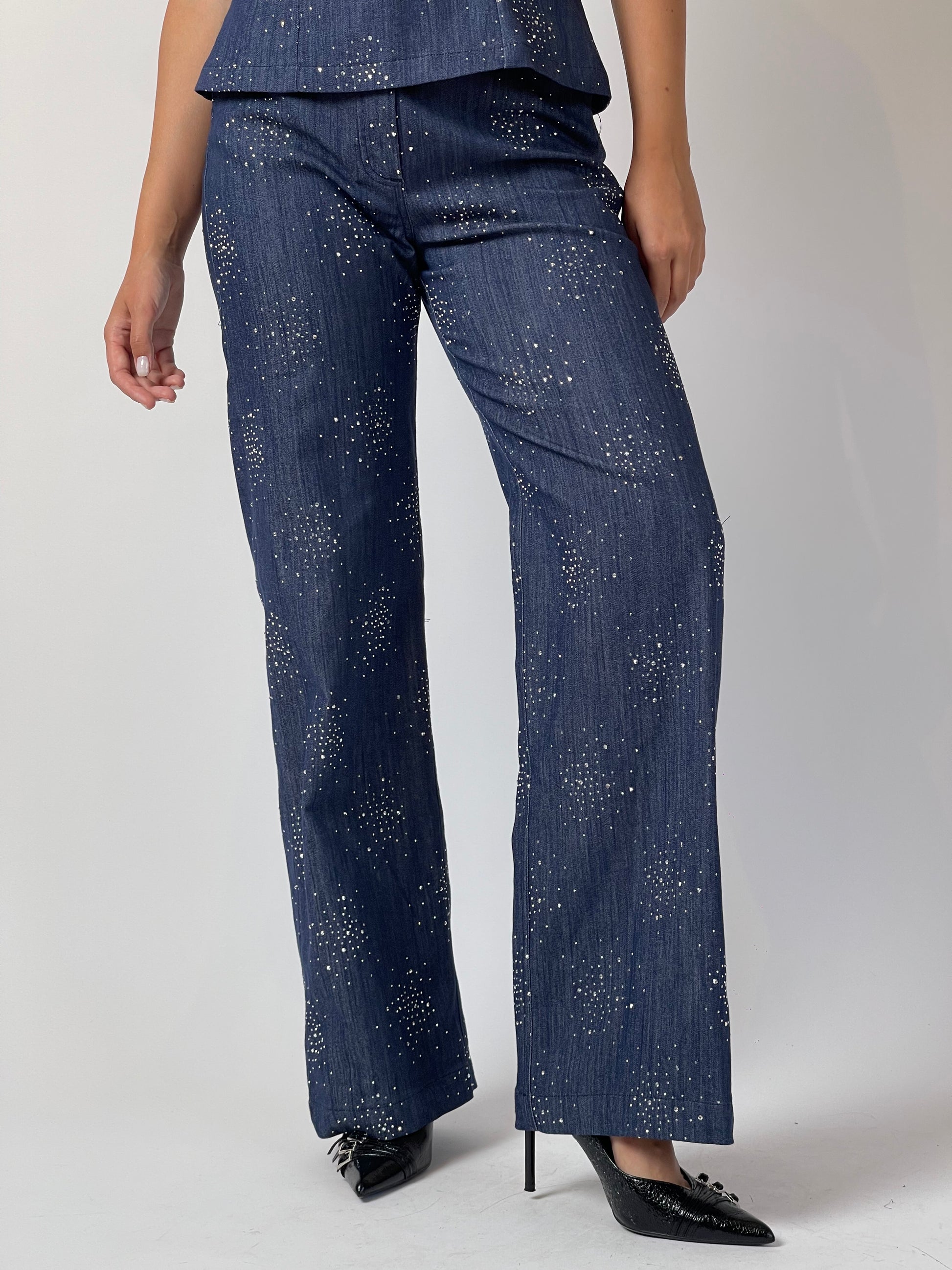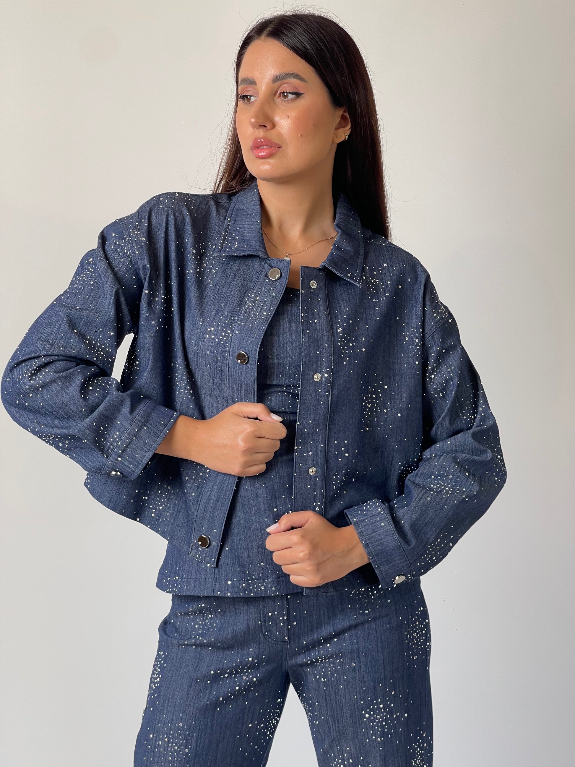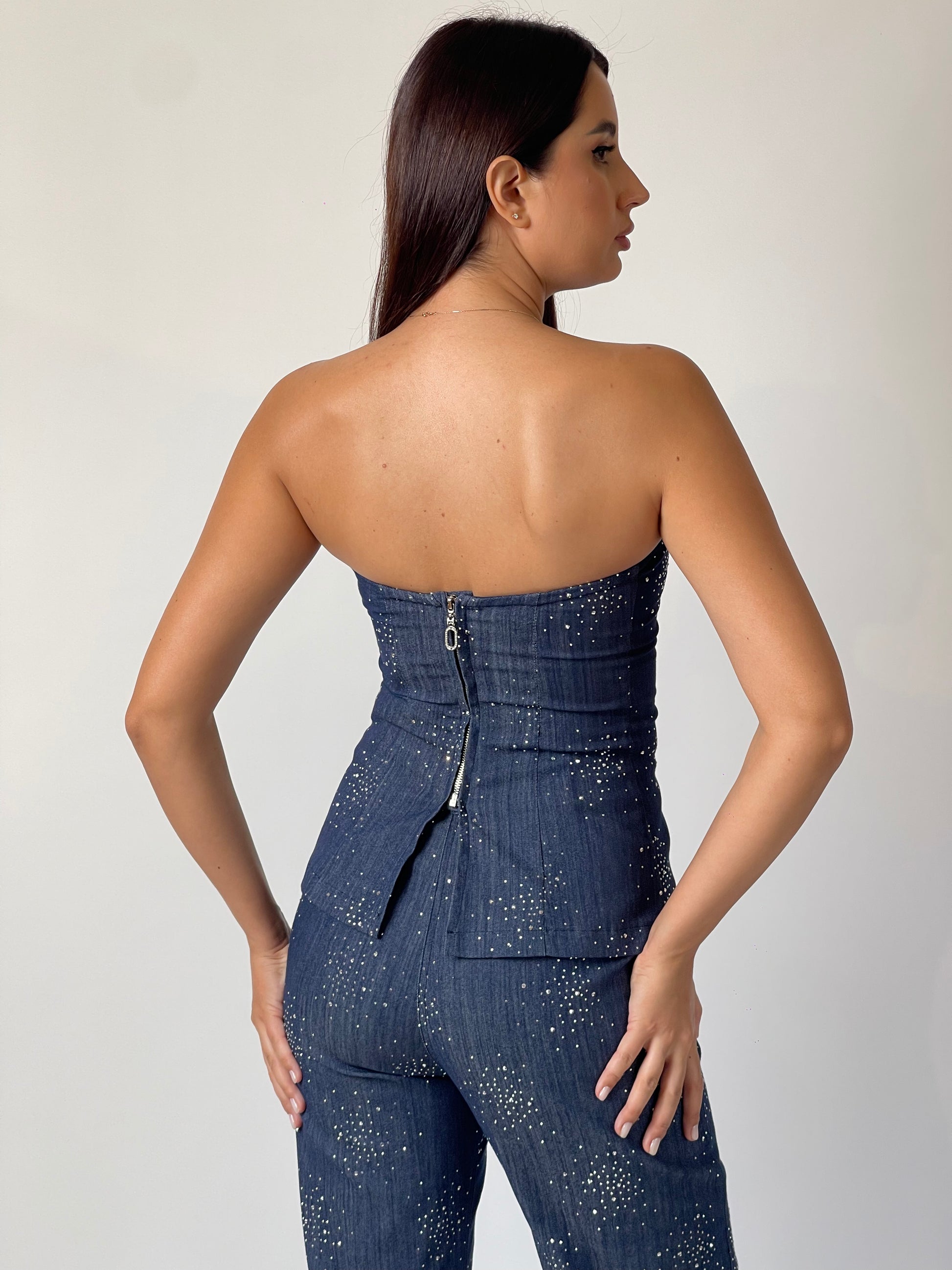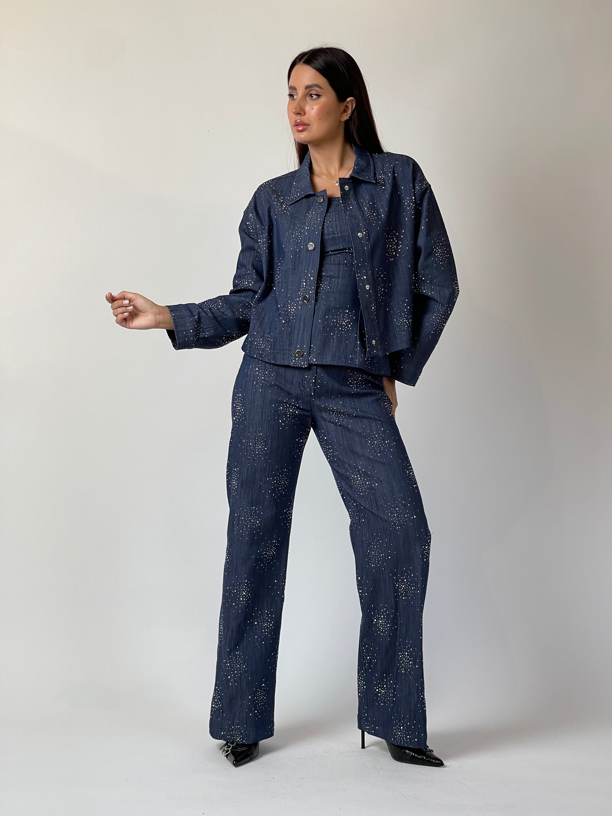 Where denim meets evening glow — Midnight Dusk Set redefines contemporary elegance. This 3-piece coord includes a structured corset top, wide-leg trousers, and a matching jacket all crafted in deep indigo denim with delicate scattered crystal embellishments that shimmer like a night sky. Designed to balance power and femininity, it’s a modern statement for both day and night.