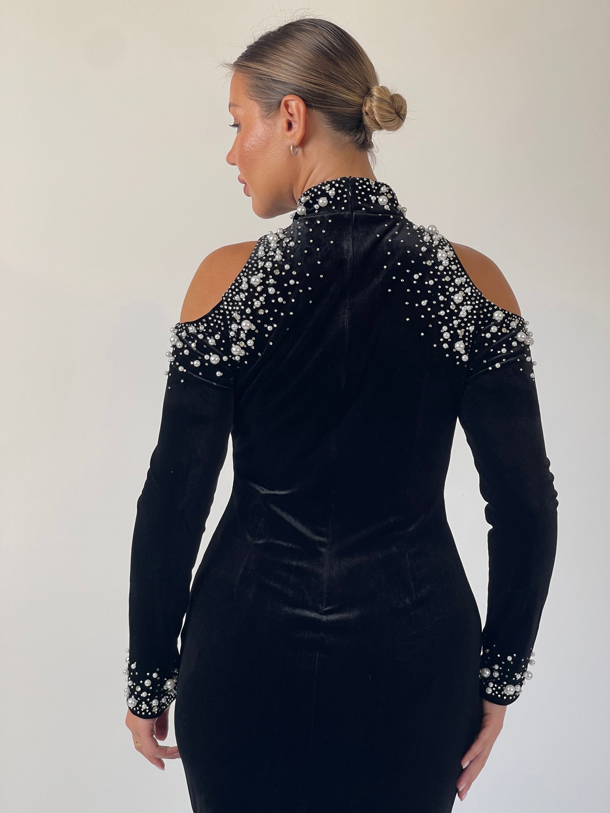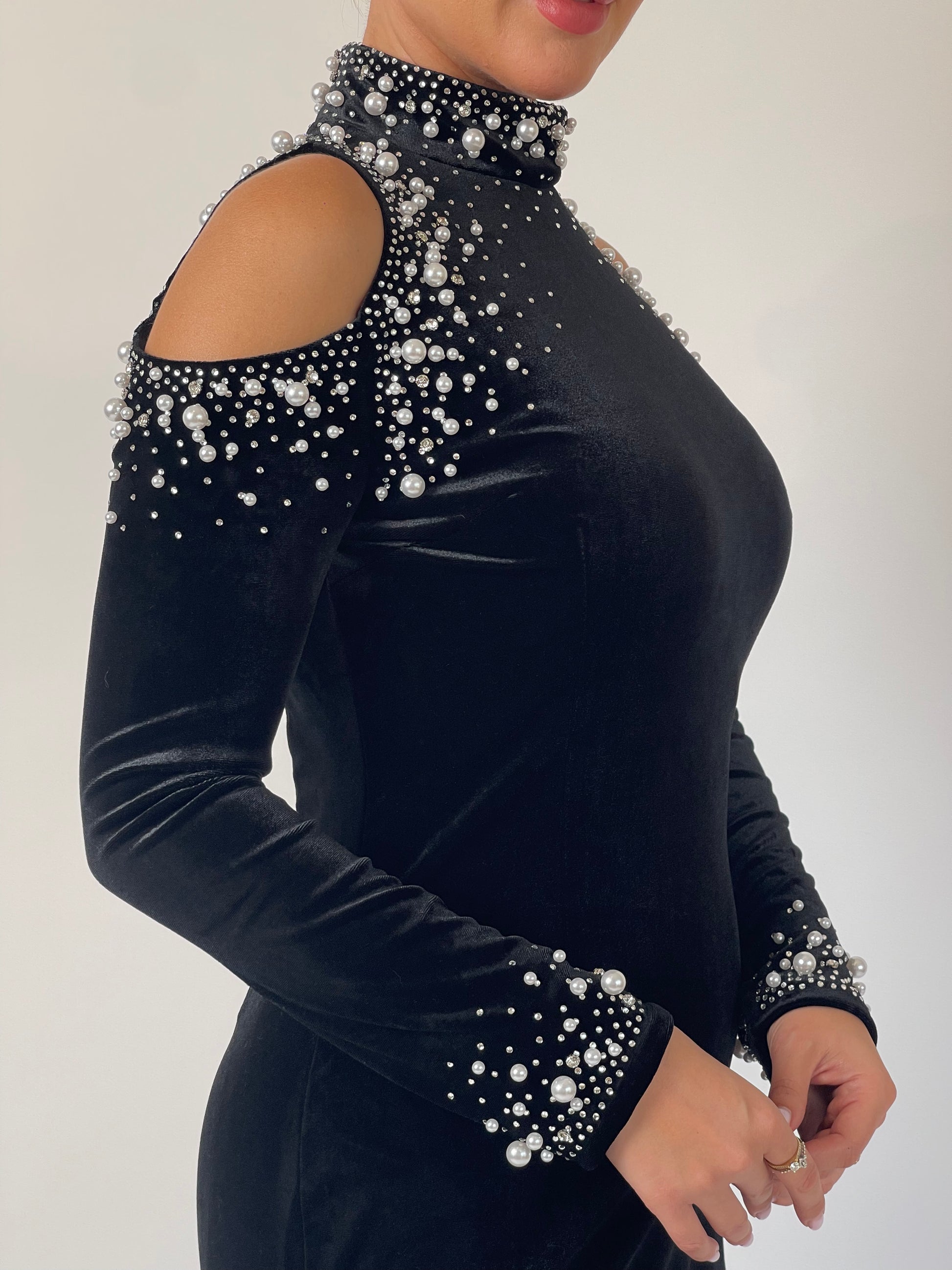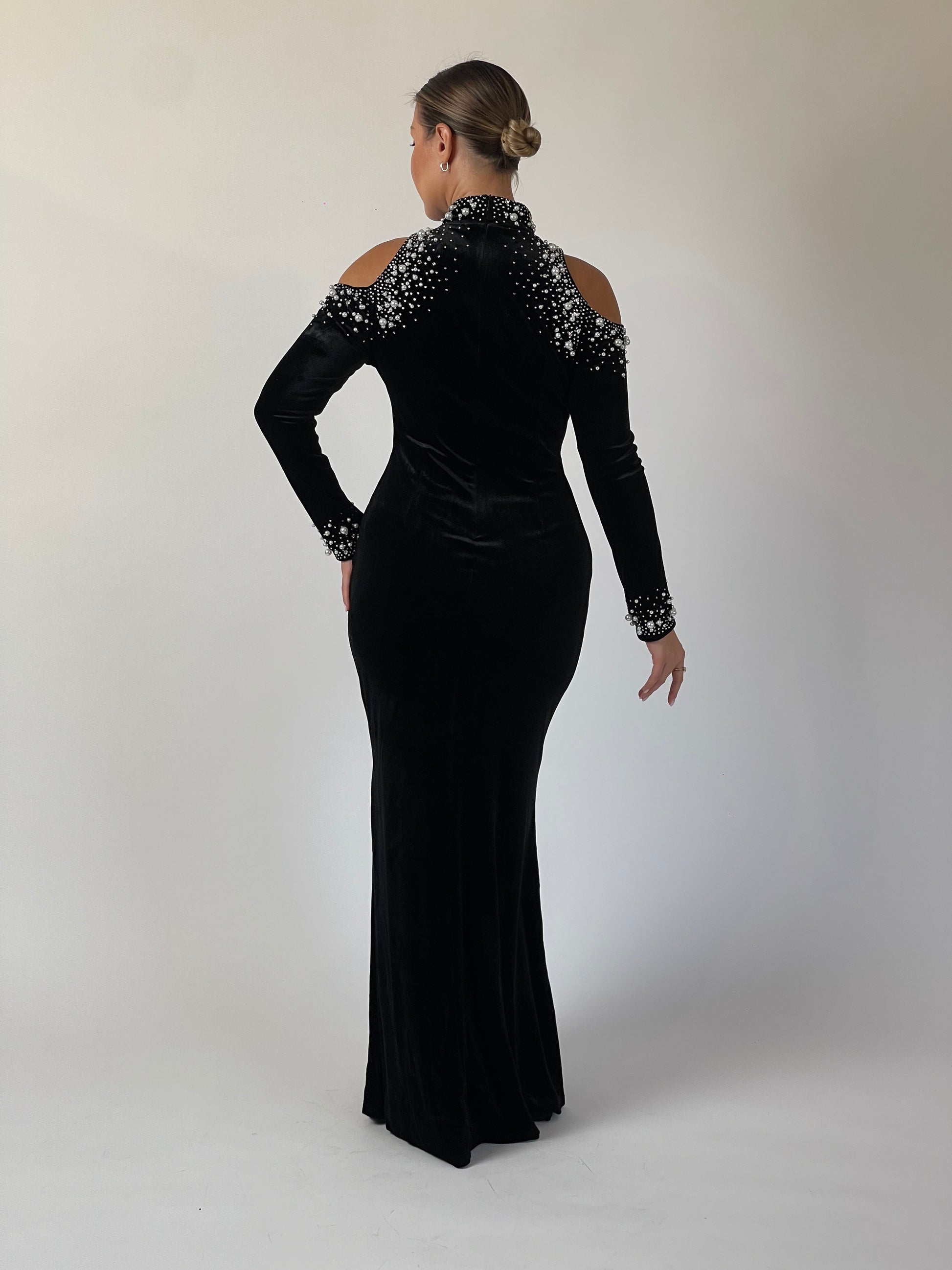 Elegance meets edge in Midnight Muse. Crafted from rich black velvet, the gown features a high neckline adorned with cascading pearls and crystals that frame the shoulders in subtle cutouts. The fitted silhouette elongates the figure, while the embellished cuffs add a final touch of radiance. Understated yet magnetic — designed for timeless sophistication.