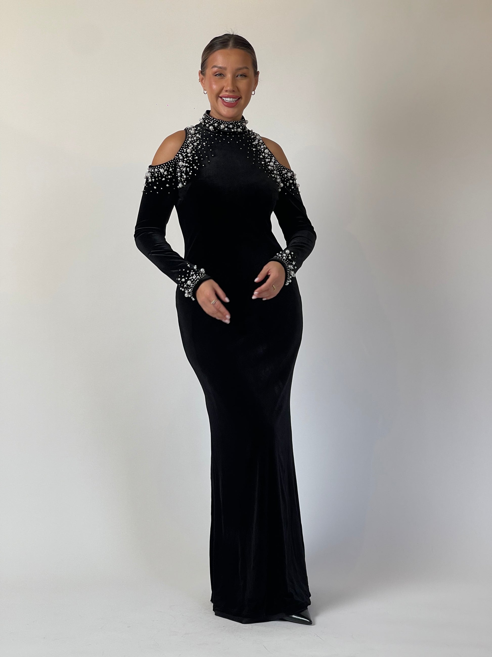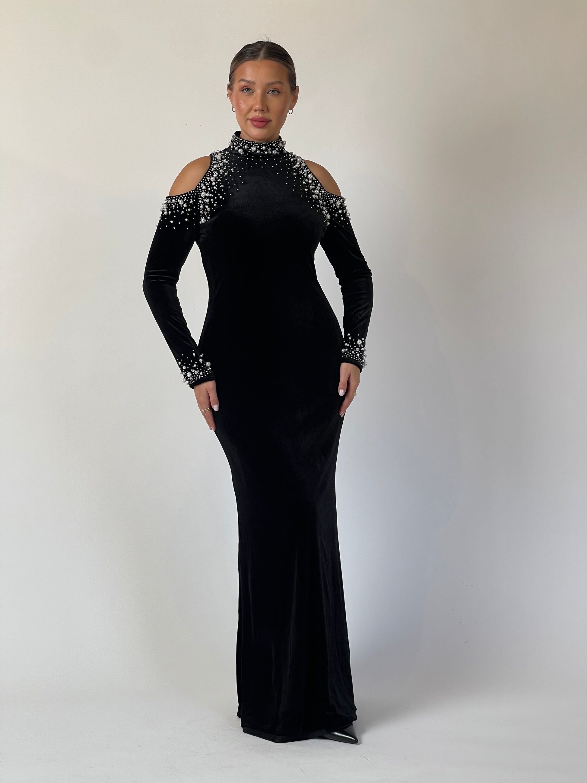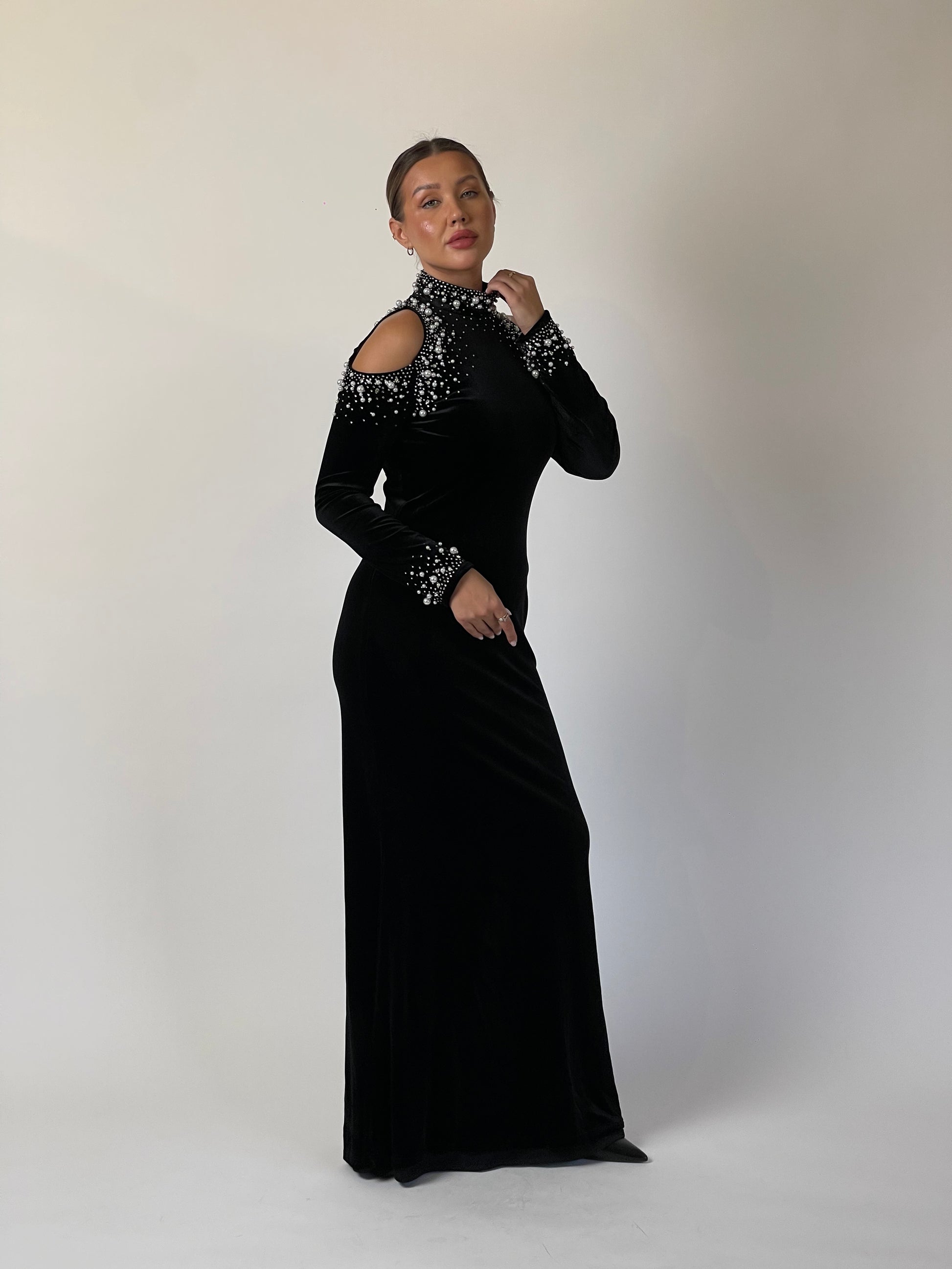 Elegance meets edge in Midnight Muse. Crafted from rich black velvet, the gown features a high neckline adorned with cascading pearls and crystals that frame the shoulders in subtle cutouts. The fitted silhouette elongates the figure, while the embellished cuffs add a final touch of radiance. Understated yet magnetic — designed for timeless sophistication.