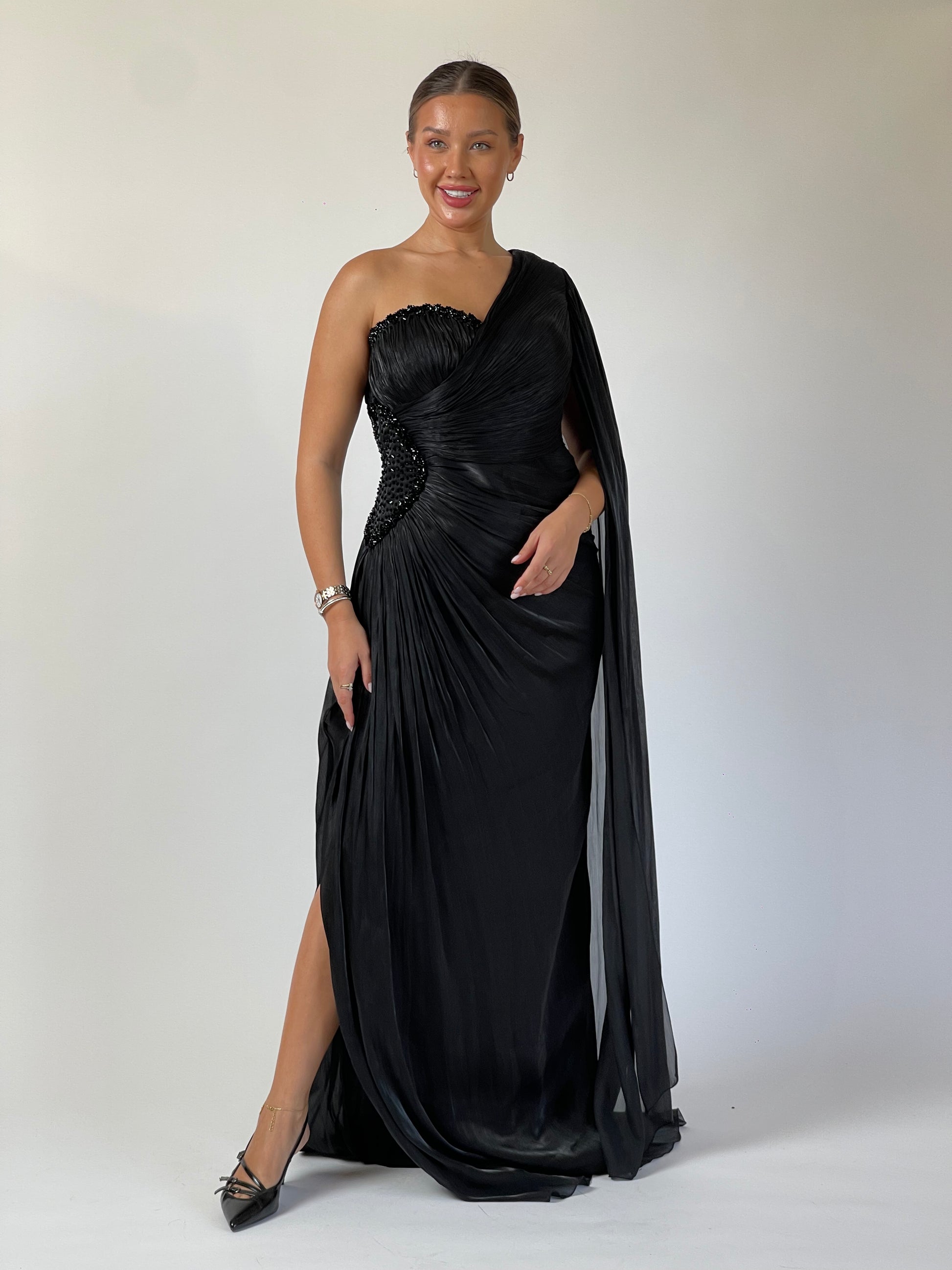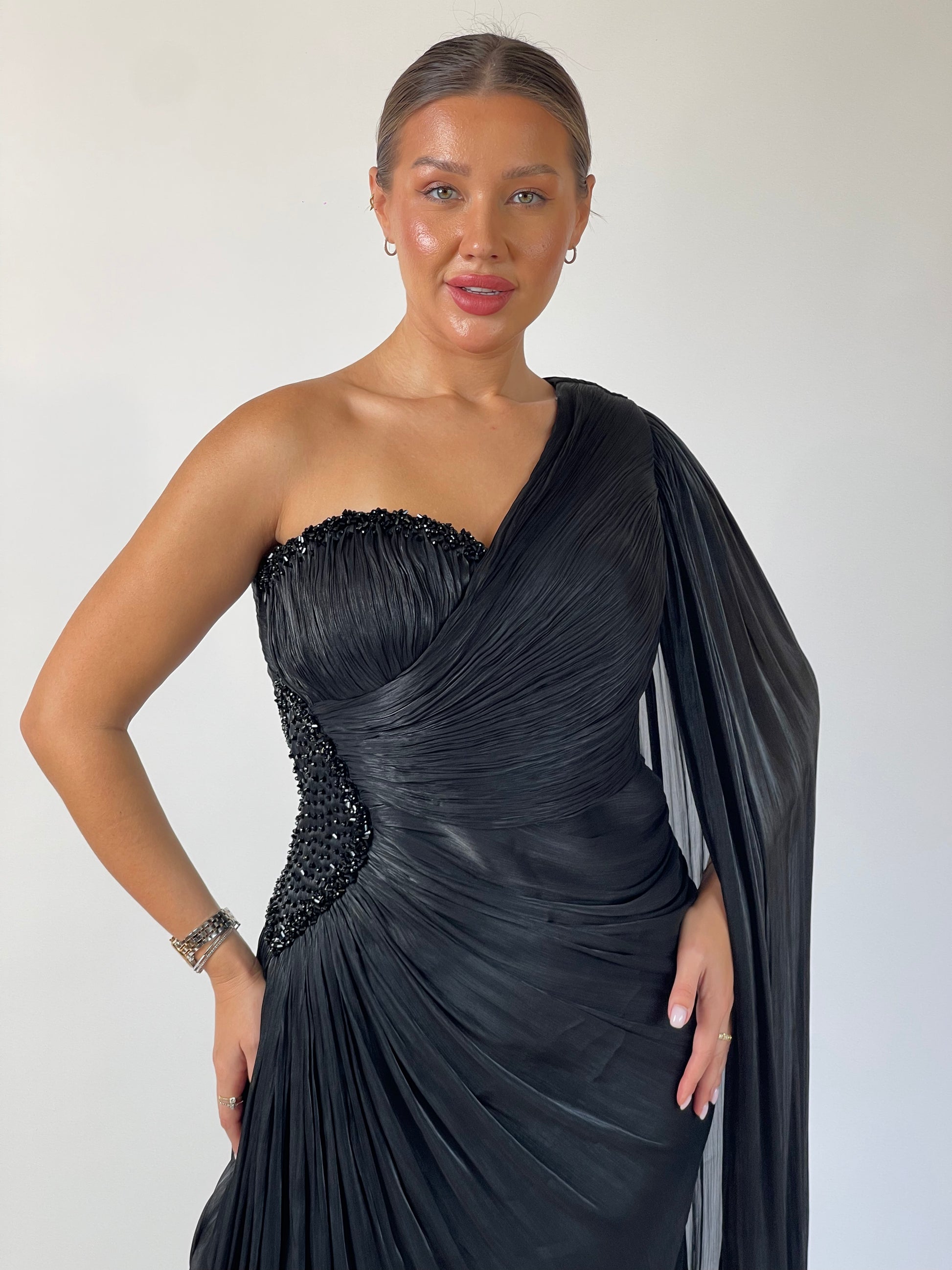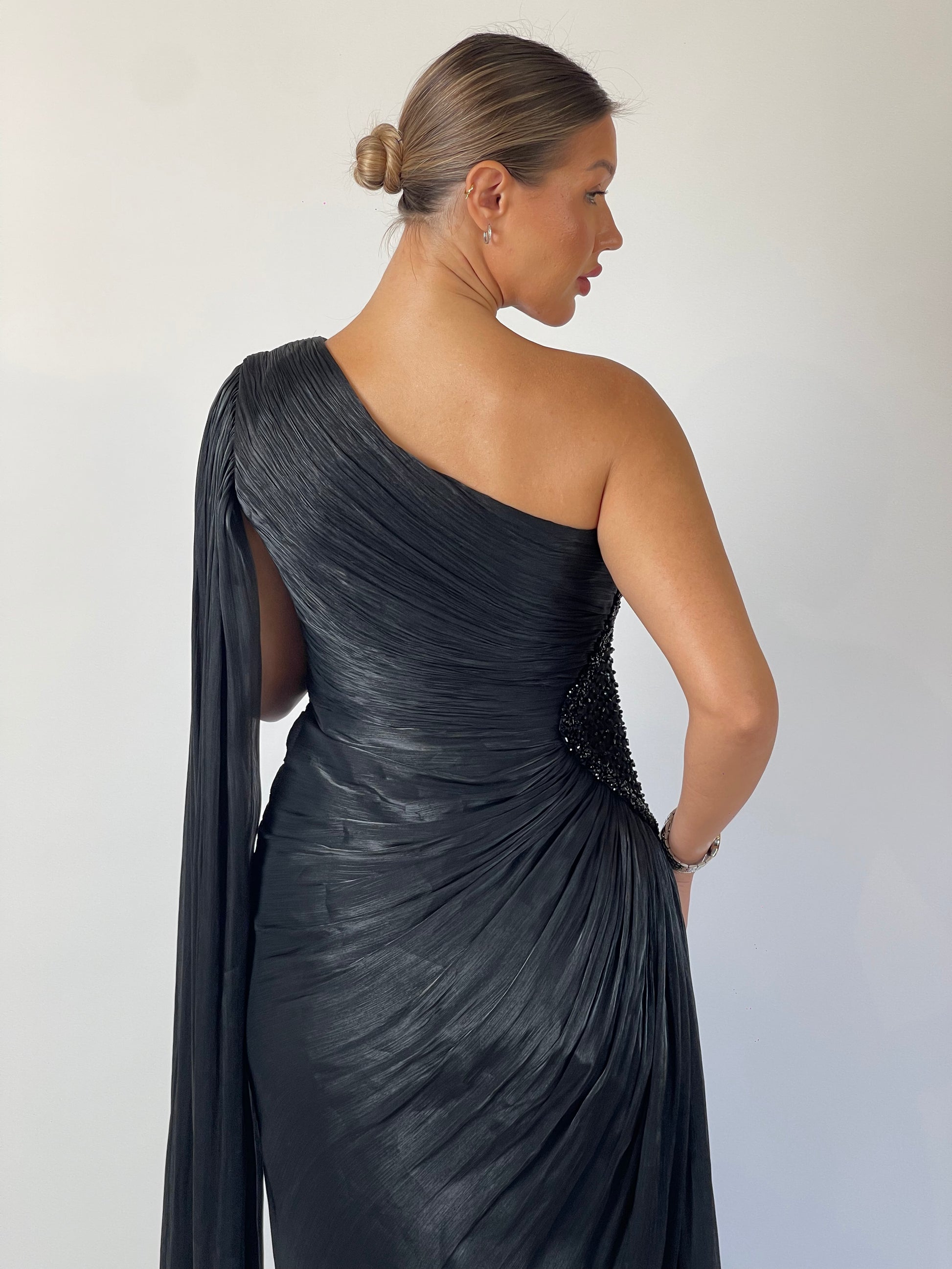 Where shadow meets silk. Midnight Veil is a sculpted one-shoulder gown draped in liquid pleats that move with grace and intent. The gathered bodice wraps effortlessly across the frame, revealing intricate beadwork that glimmers subtly with each turn. Fluid, dramatic, and impossibly refined — a modern ode to classic evening glamour.