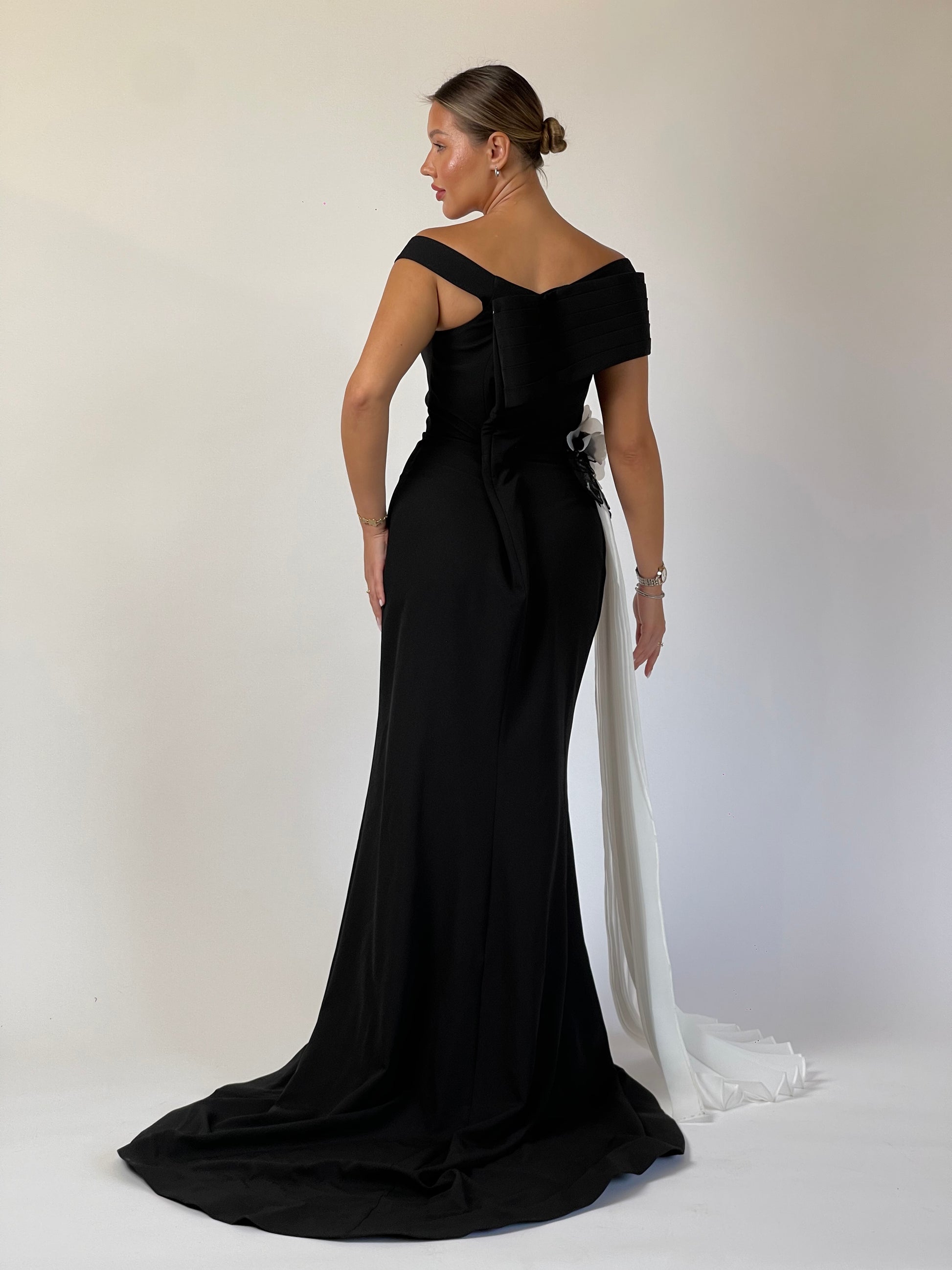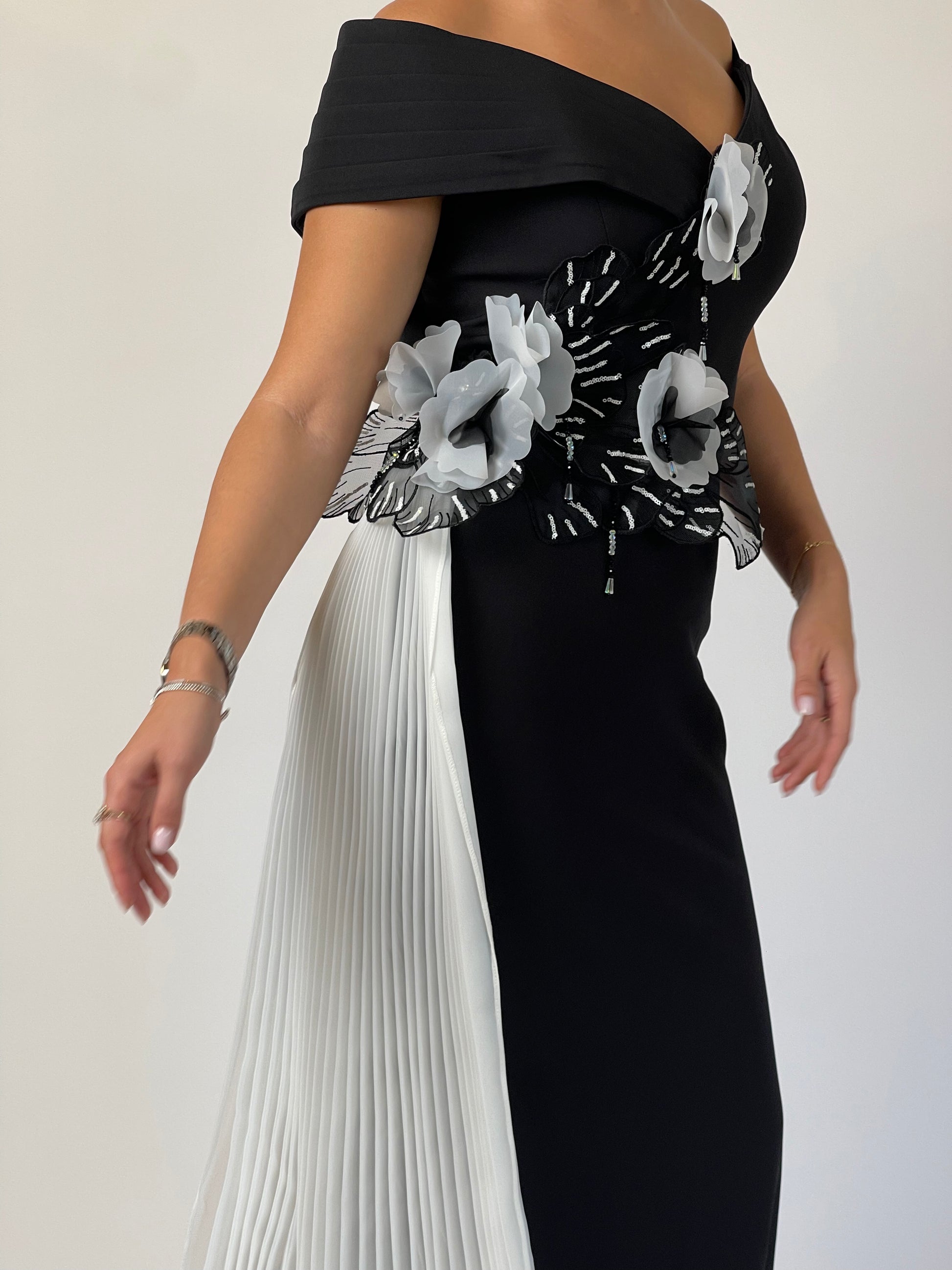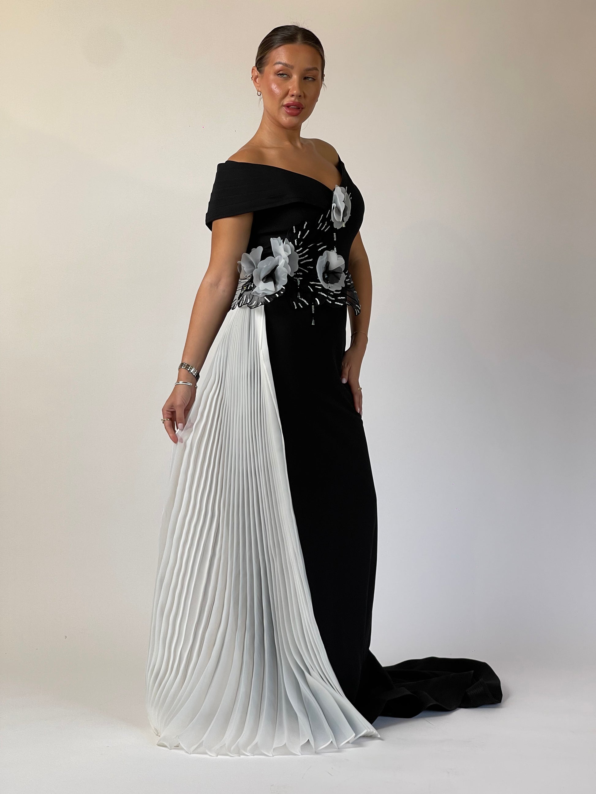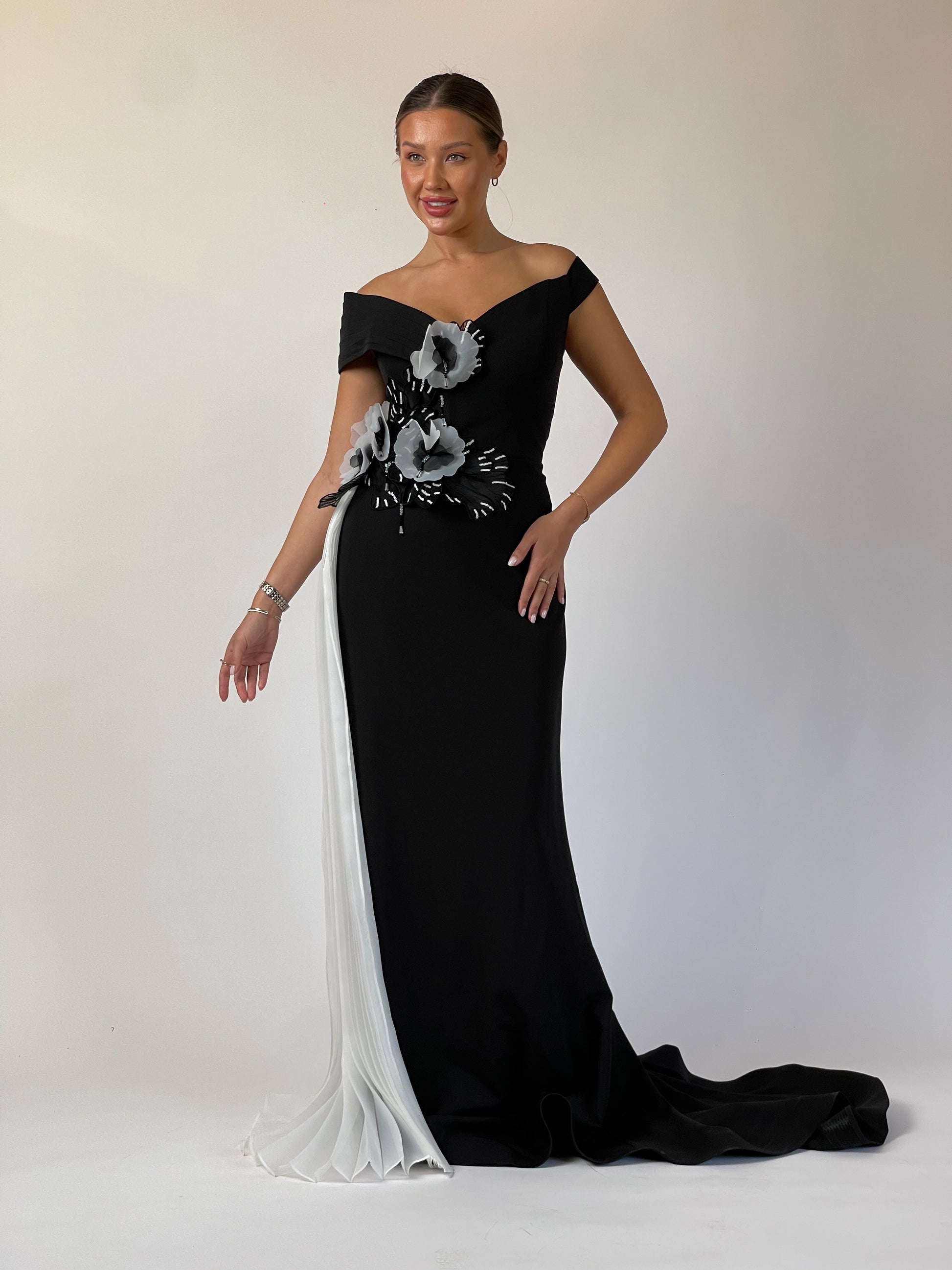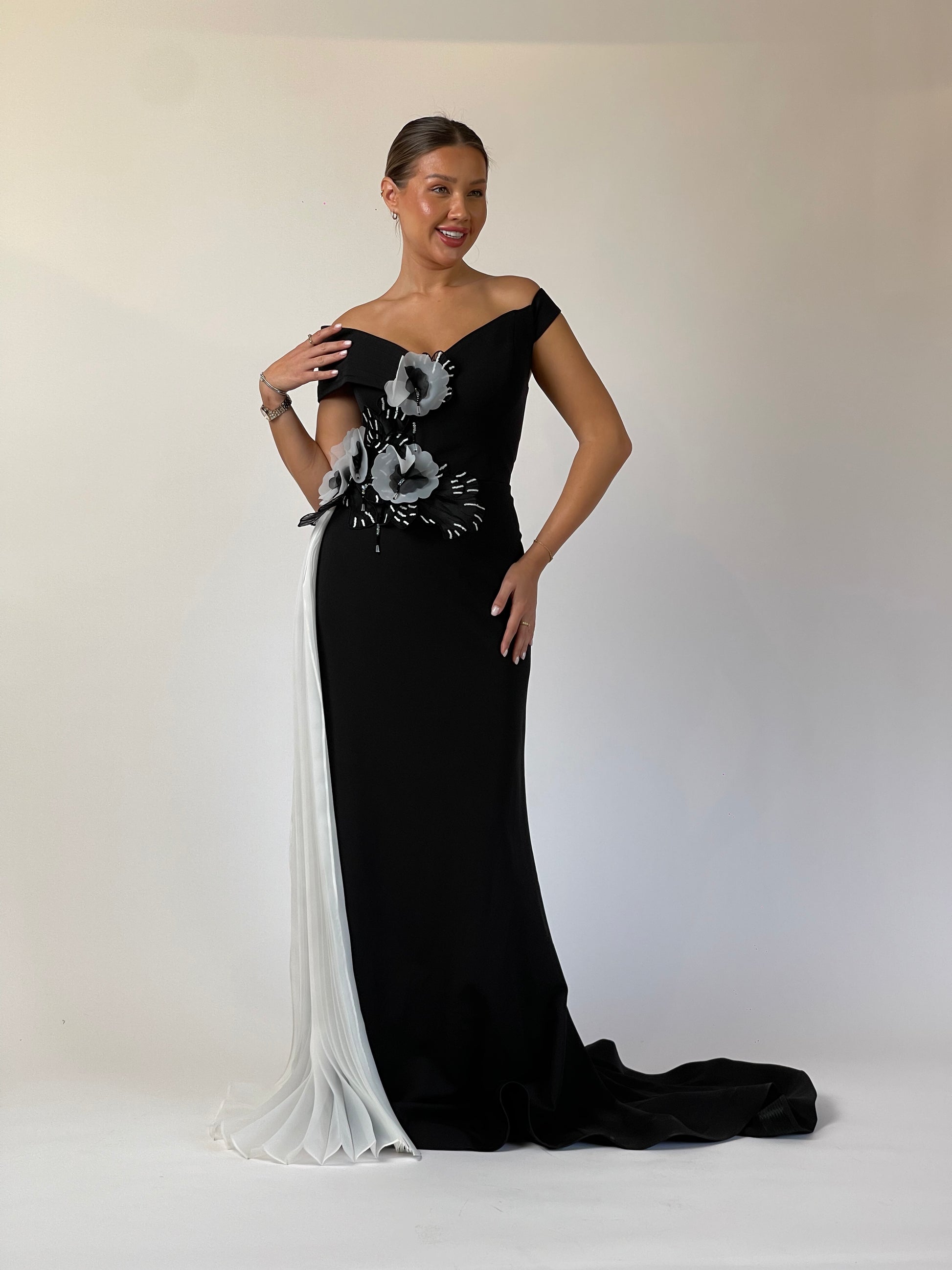 Effortlessly poised, Monochrome Whisper plays with contrast in its most elegant form. The off-shoulder neckline flows into a sculpted silhouette, adorned with soft 3D florals and a cascading white pleated panel. A gown that speaks in quiet tones but leaves a lasting impression.