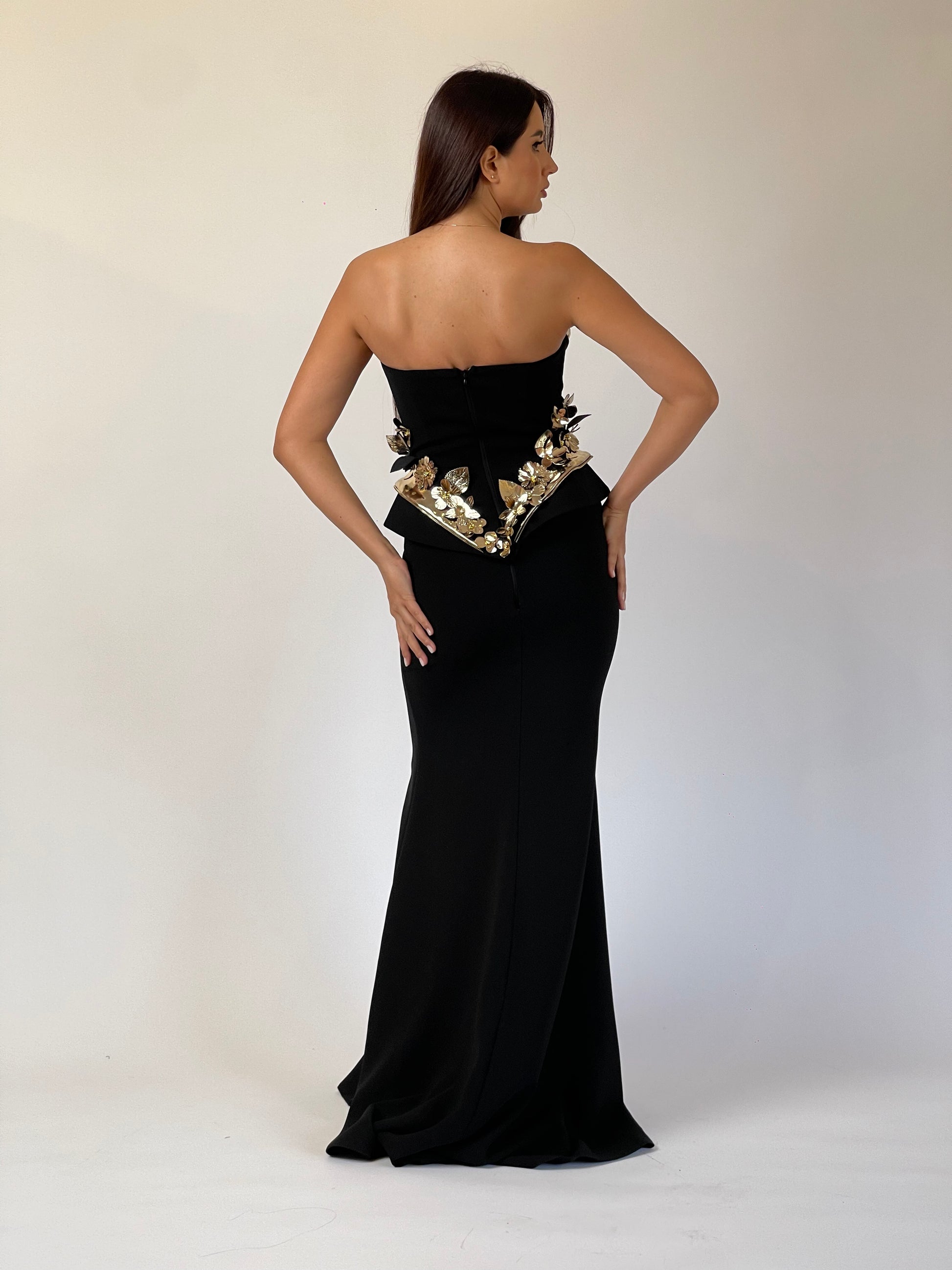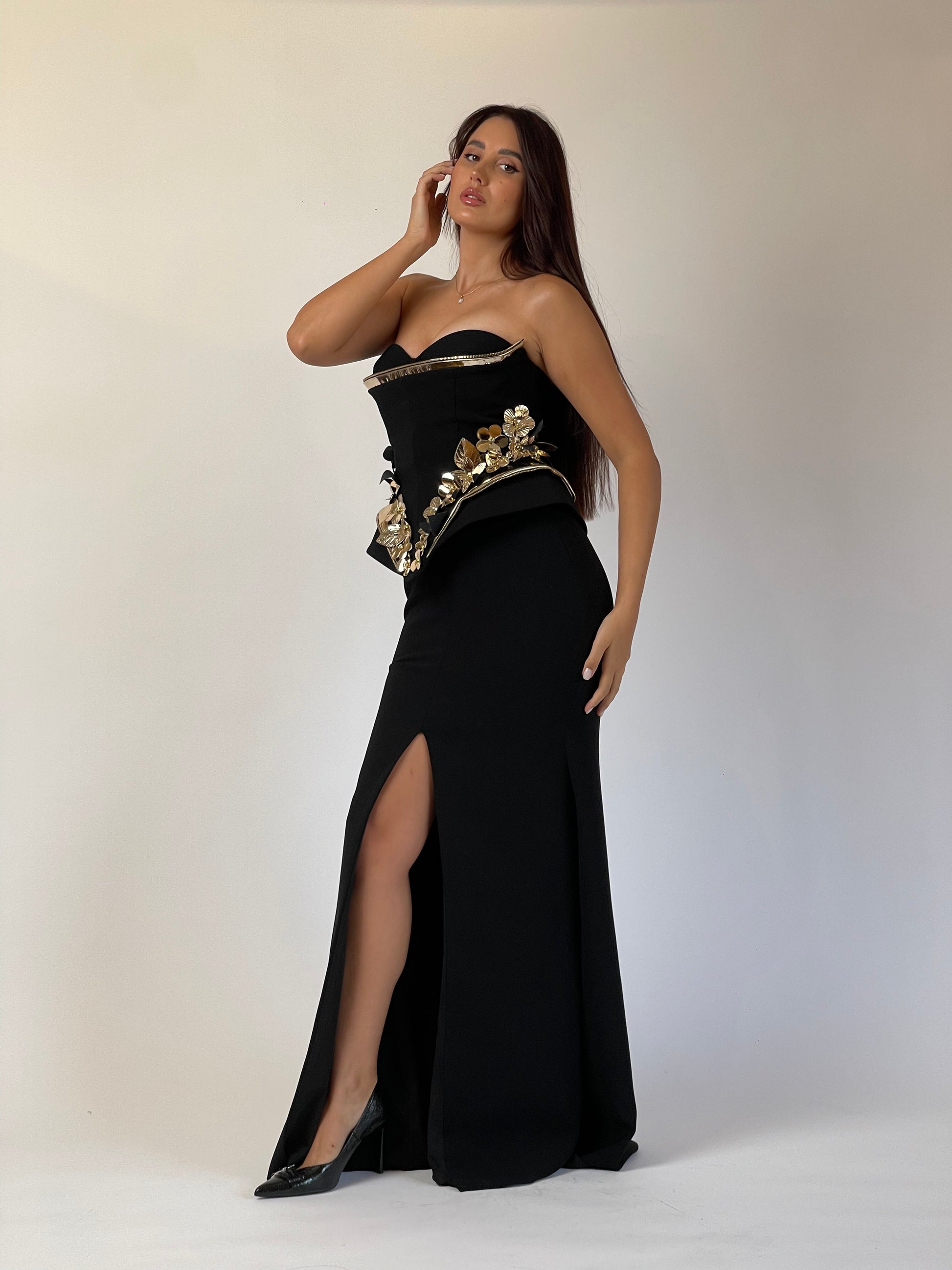 A masterpiece of structure and seduction — the Noir Royale gown features a sculpted corset with gold metallic accents and 3D floral embellishments. The sleek silhouette and daring slit create a look that’s both commanding and impossibly elegant.