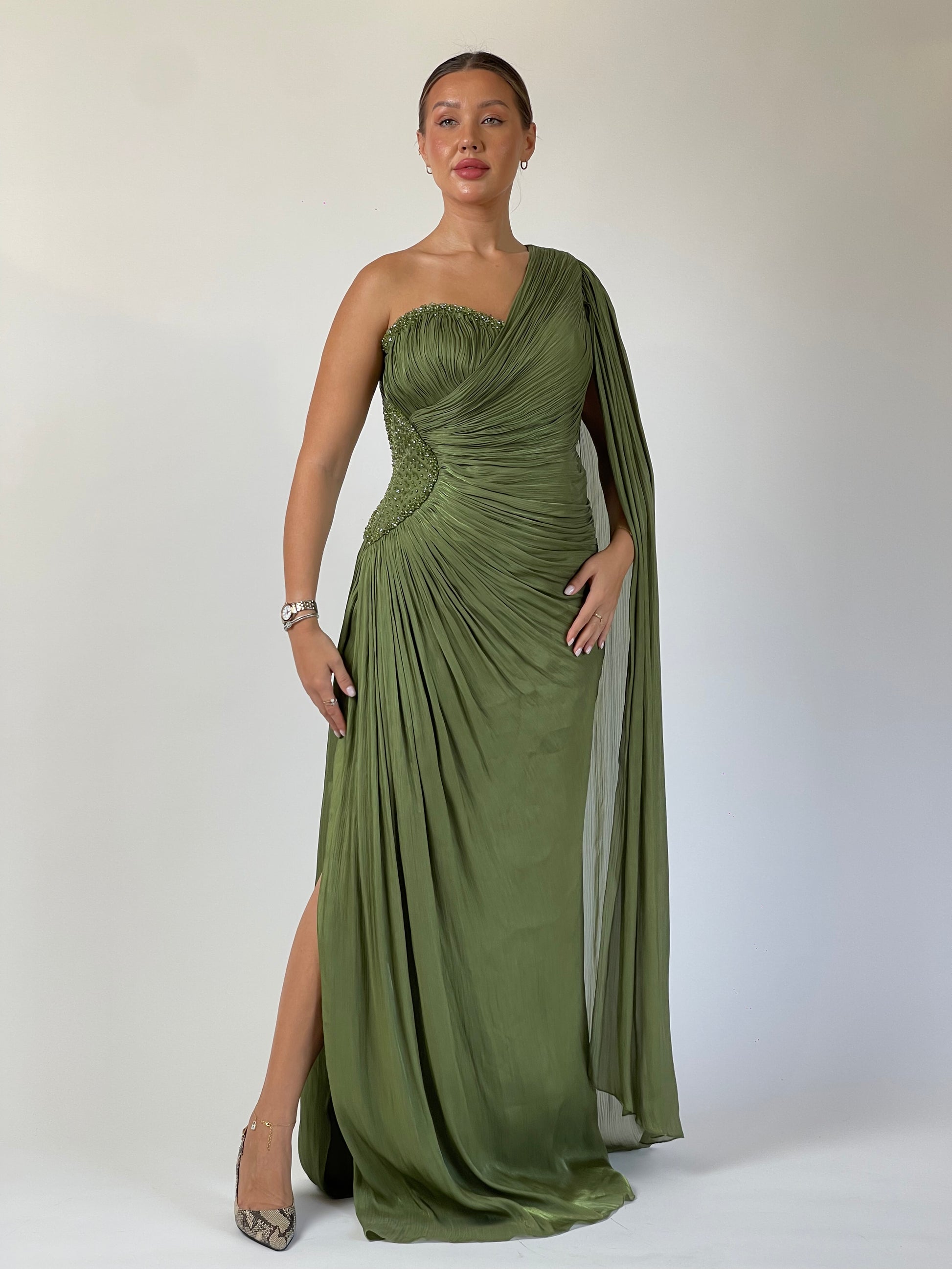A gown that feels sculpted by nature itself. Olive Mirage drapes in fluid precision, wrapping the body with soft pleats that glimmer subtly under the light. The asymmetrical neckline and one-shoulder sleeve create a statuesque balance, while delicate beadwork at the waist adds quiet opulence. Effortless yet commanding — an ode to timeless evening glamour.