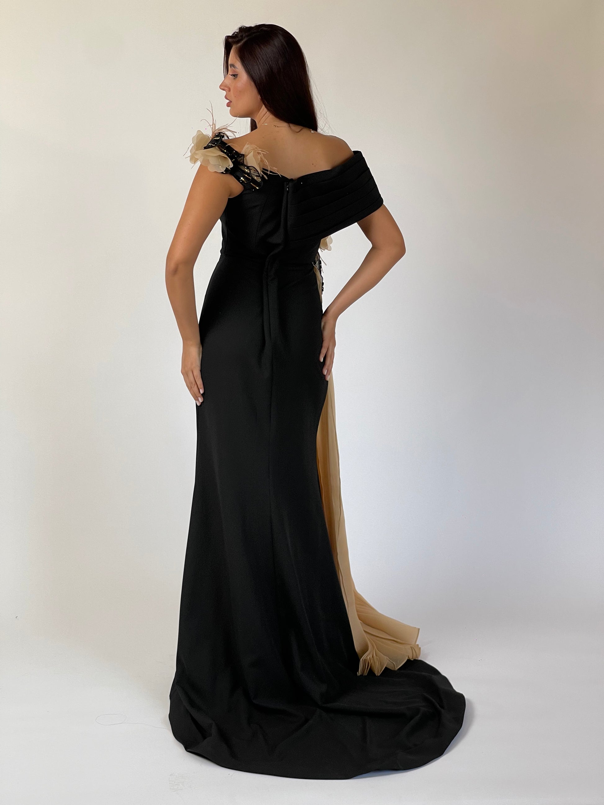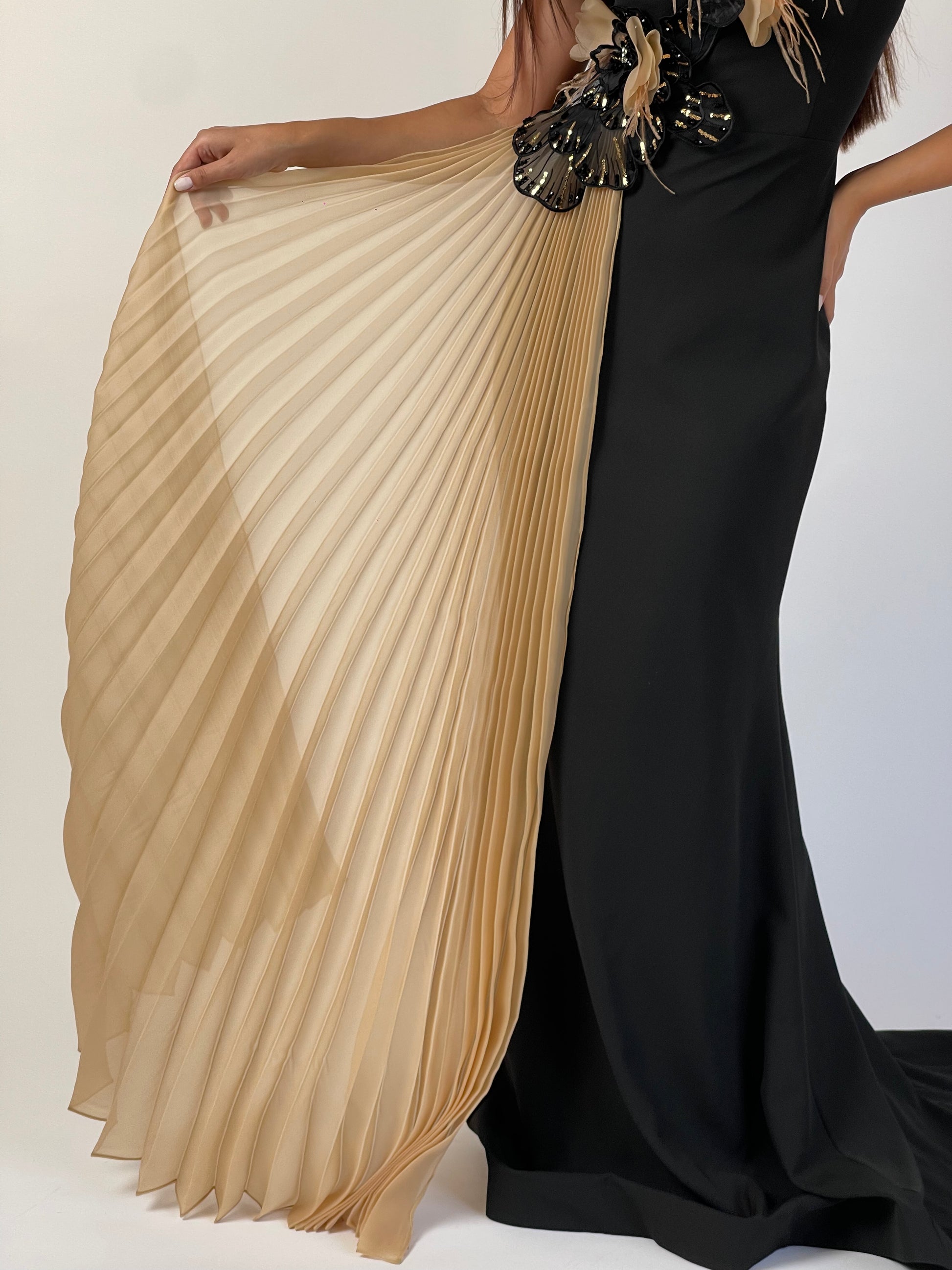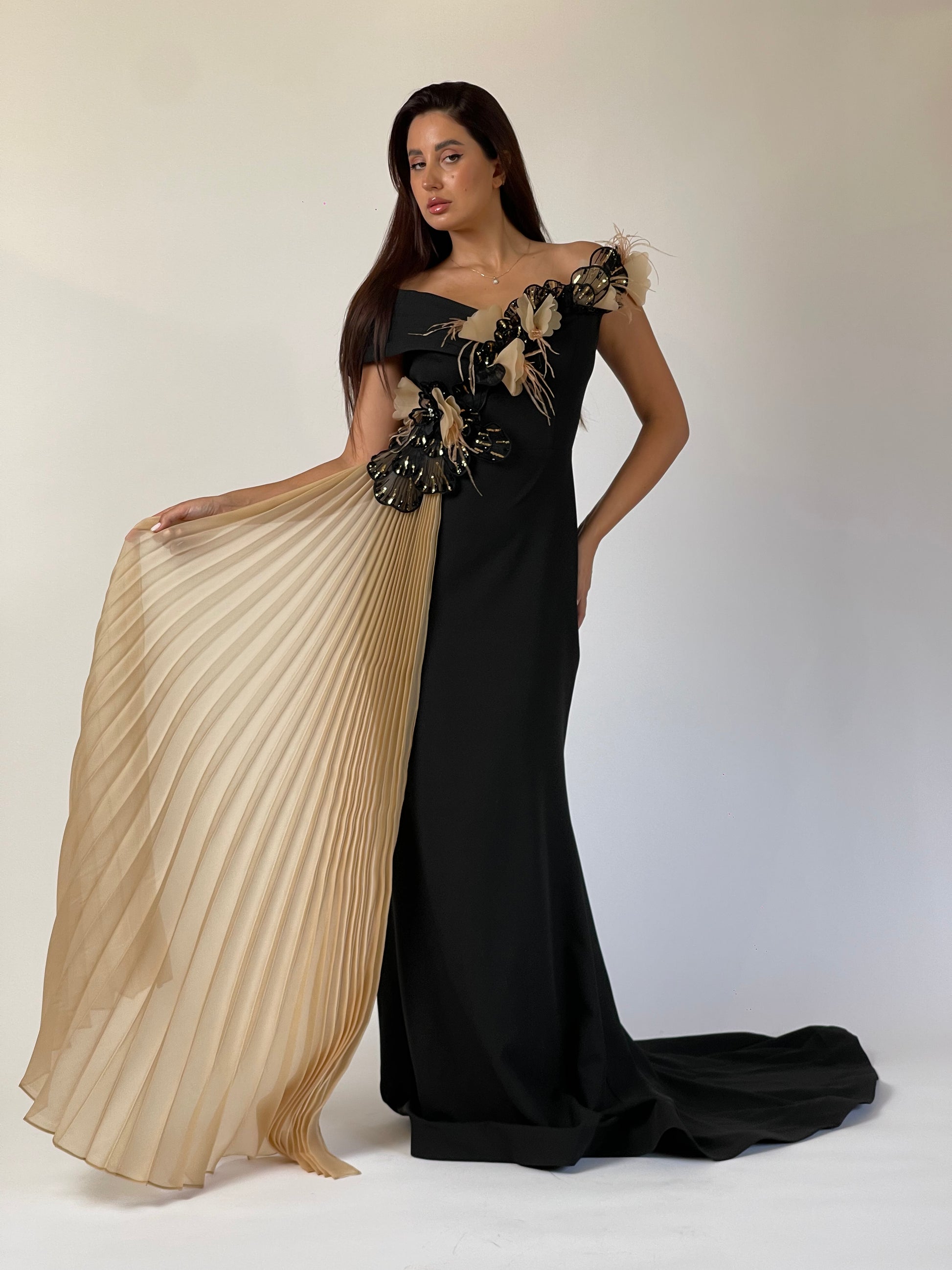 A sculptural creation that moves between strength and grace. Sable Bloom combines deep black fabric with cascading nude pleats and hand-crafted floral appliqués. The off-shoulder cut frames the neckline beautifully, while every curve of the silhouette whispers quiet confidence.