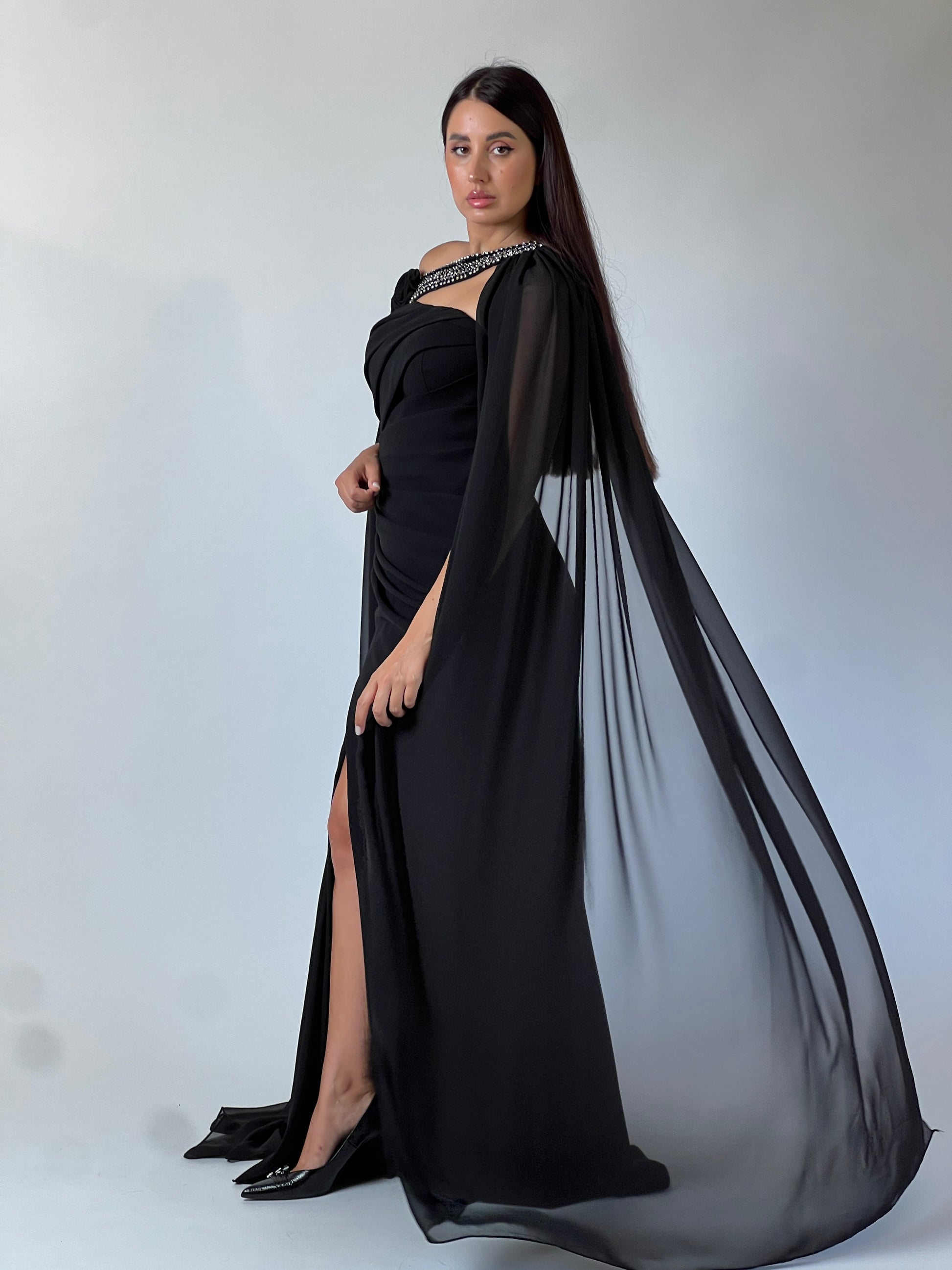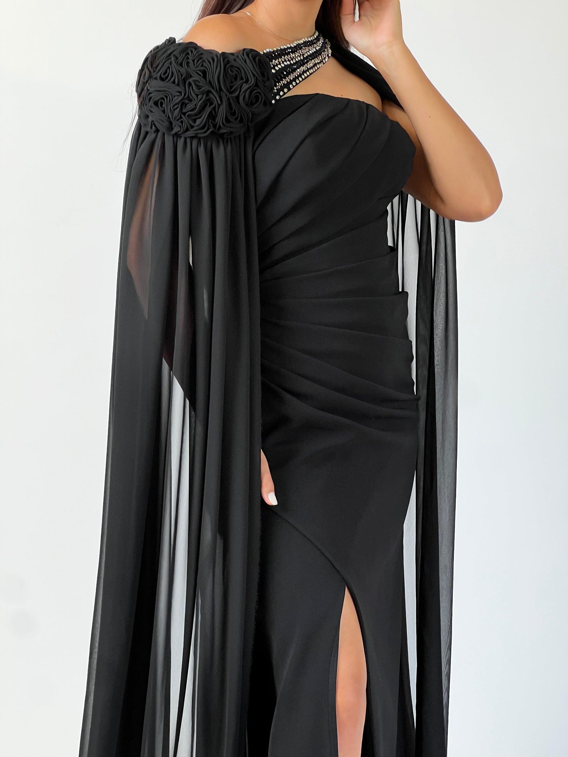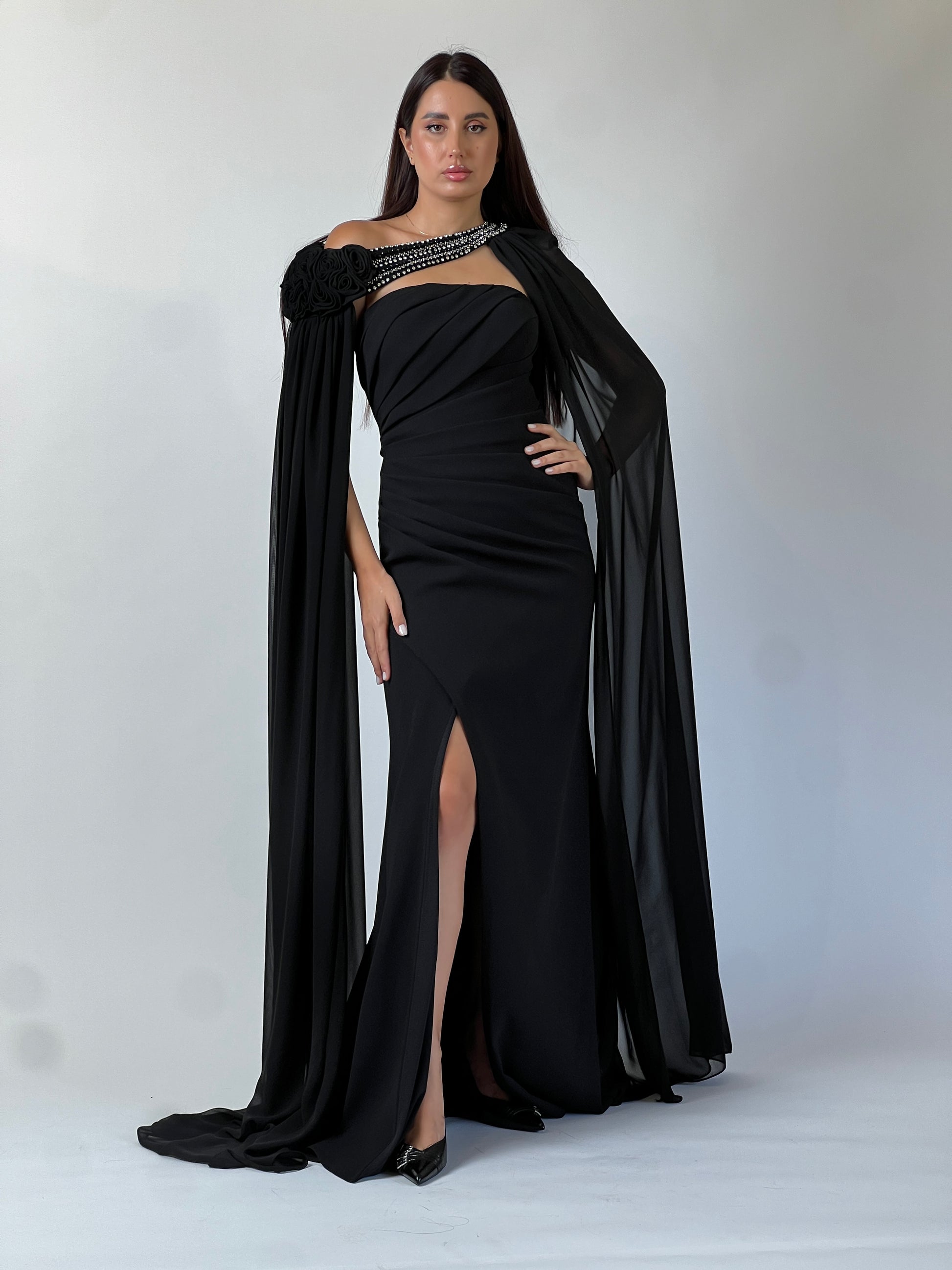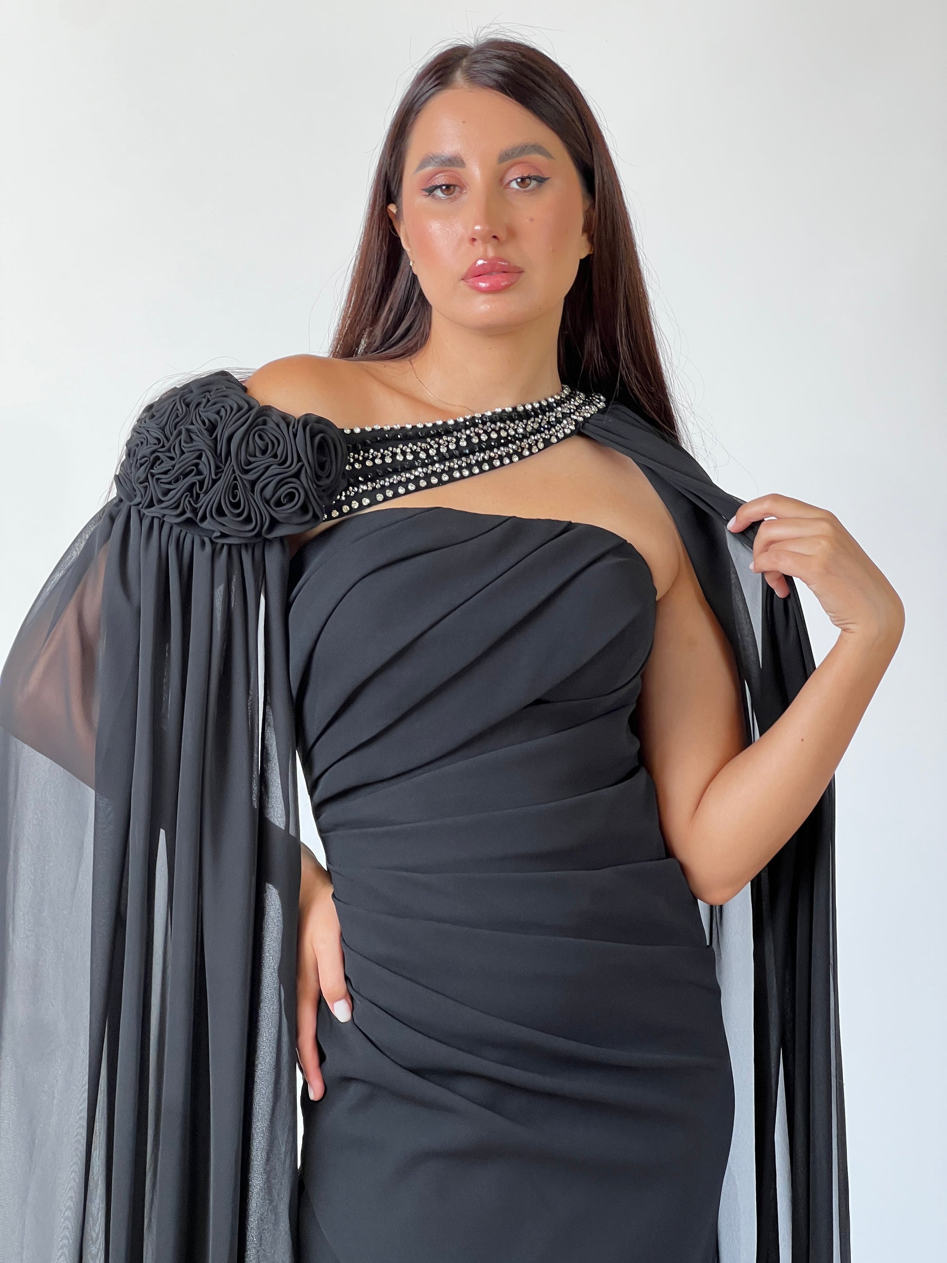 A gown that whispers power in every fold. Shadow Rose is sculpted in black chiffon and crepe, featuring an asymmetric draped bodice that flows into a cascading cape sleeve. Embellished roses and crystal beadwork crown the shoulder, creating a balance of strength and grace. Designed for women who leave an impression long after they’ve left the room.