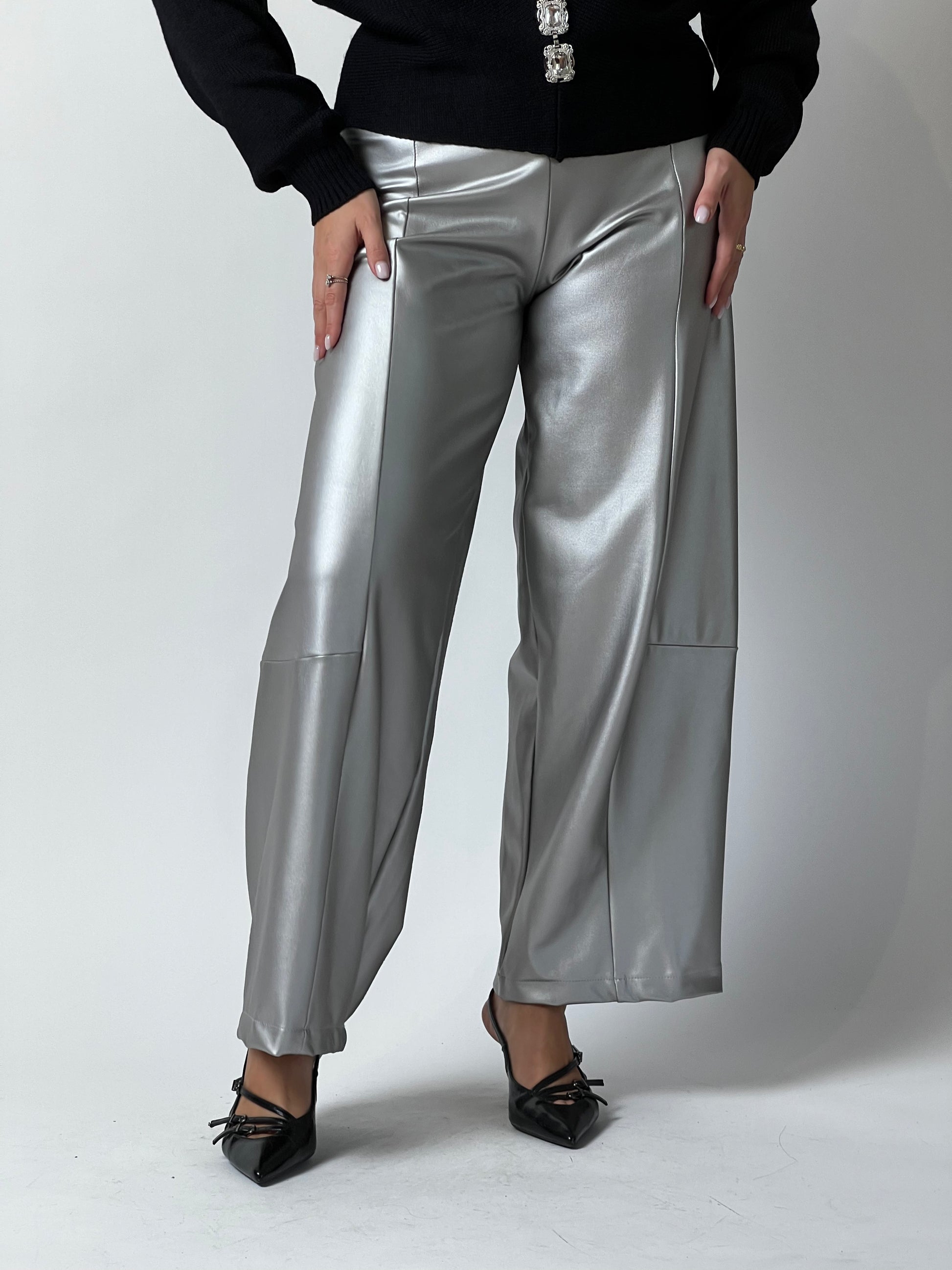 The Silver Faux Leather Wide-Leg Pants redefine the modern edge. Designed in a lustrous silver finish, these pants feature a high waist and fluid silhouette that elongates the legs while keeping comfort at the core. Pair them with knits, corsets, or blazers for a sleek, futuristic statement.