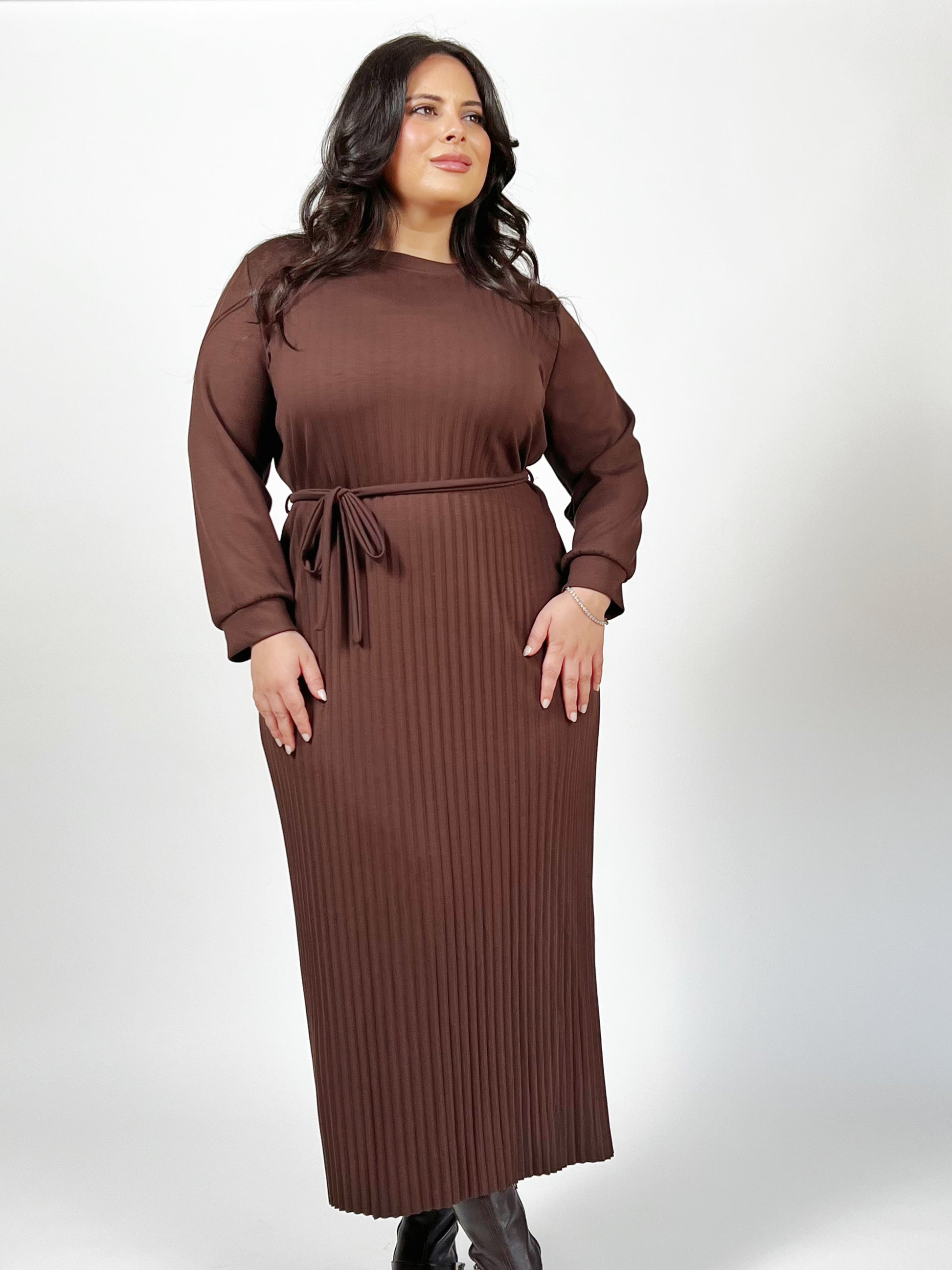 Made from heavy jersey cotton in a rich chocolate hue, this dress features fine pleating and a matching waist tie for a softly defined silhouette. Minimal, elegant, and effortlessly refined.