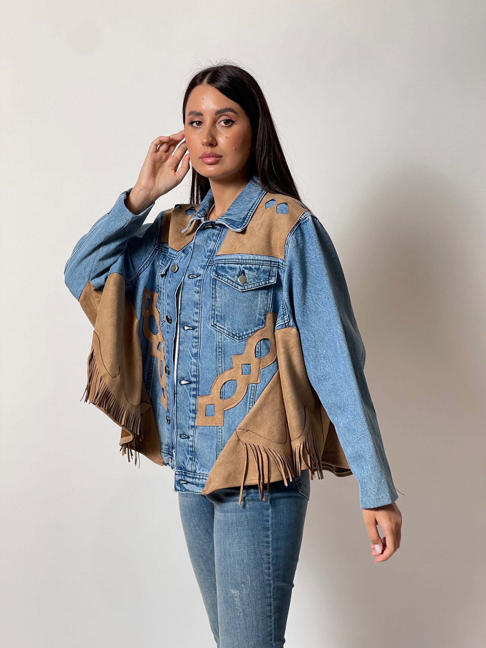 The Western Fringe Denim Jacket brings a new edge to casual sophistication. With tan suede panels, laser-cut detailing, and fringe sides, this oversized piece redefines denim with a bold, crafted touch. Perfect for layering — this jacket tells a story of movement, texture, and effortless cool.